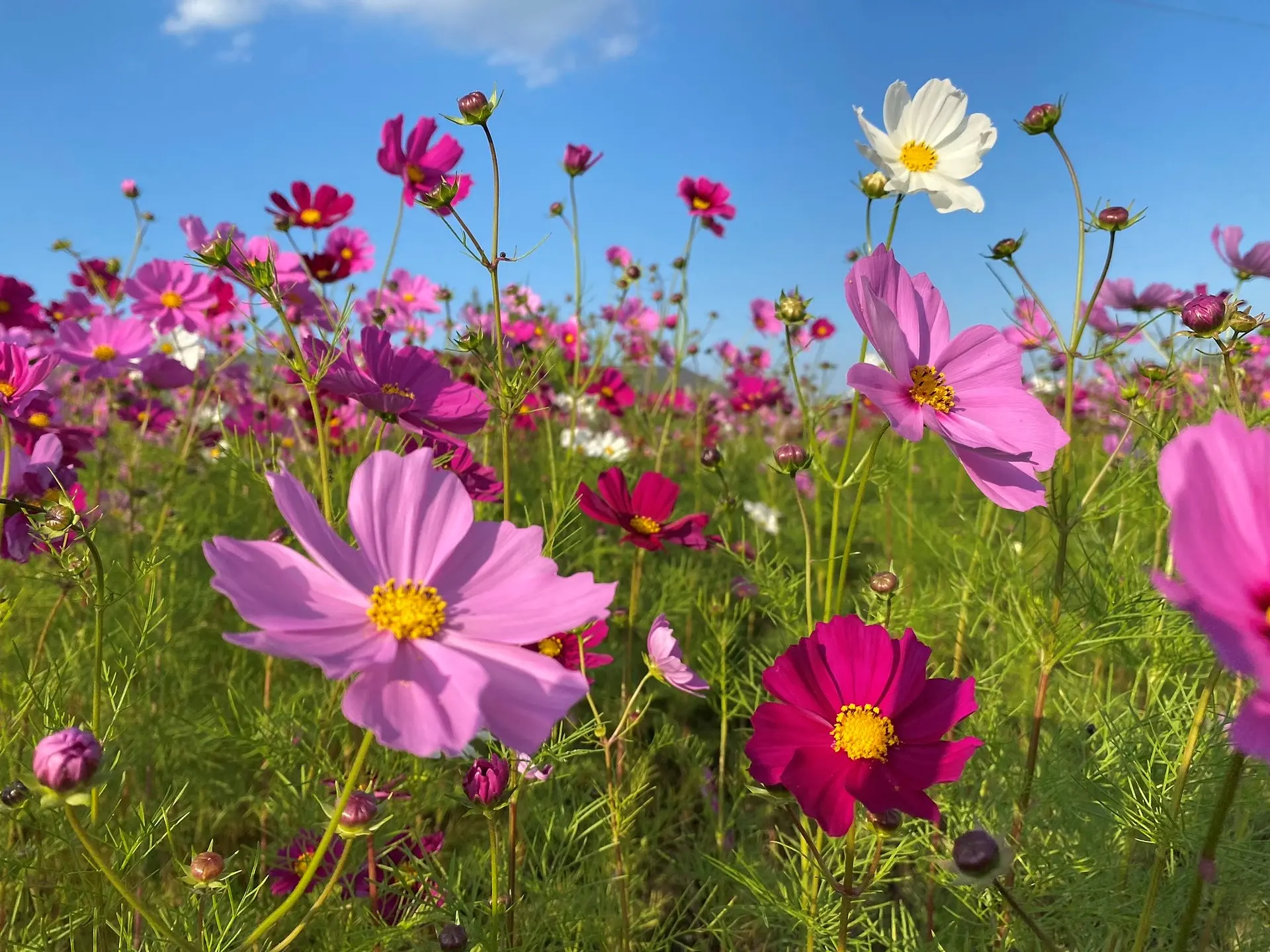 緩やかな斜面に広がる濃淡ピンクと白のコスモスの花が咲き広がる姿は、まさに秋の絶景!撮影せずにいられないSNS映えするフォトスポットもあって、秋の絶景を堪能することができます。
