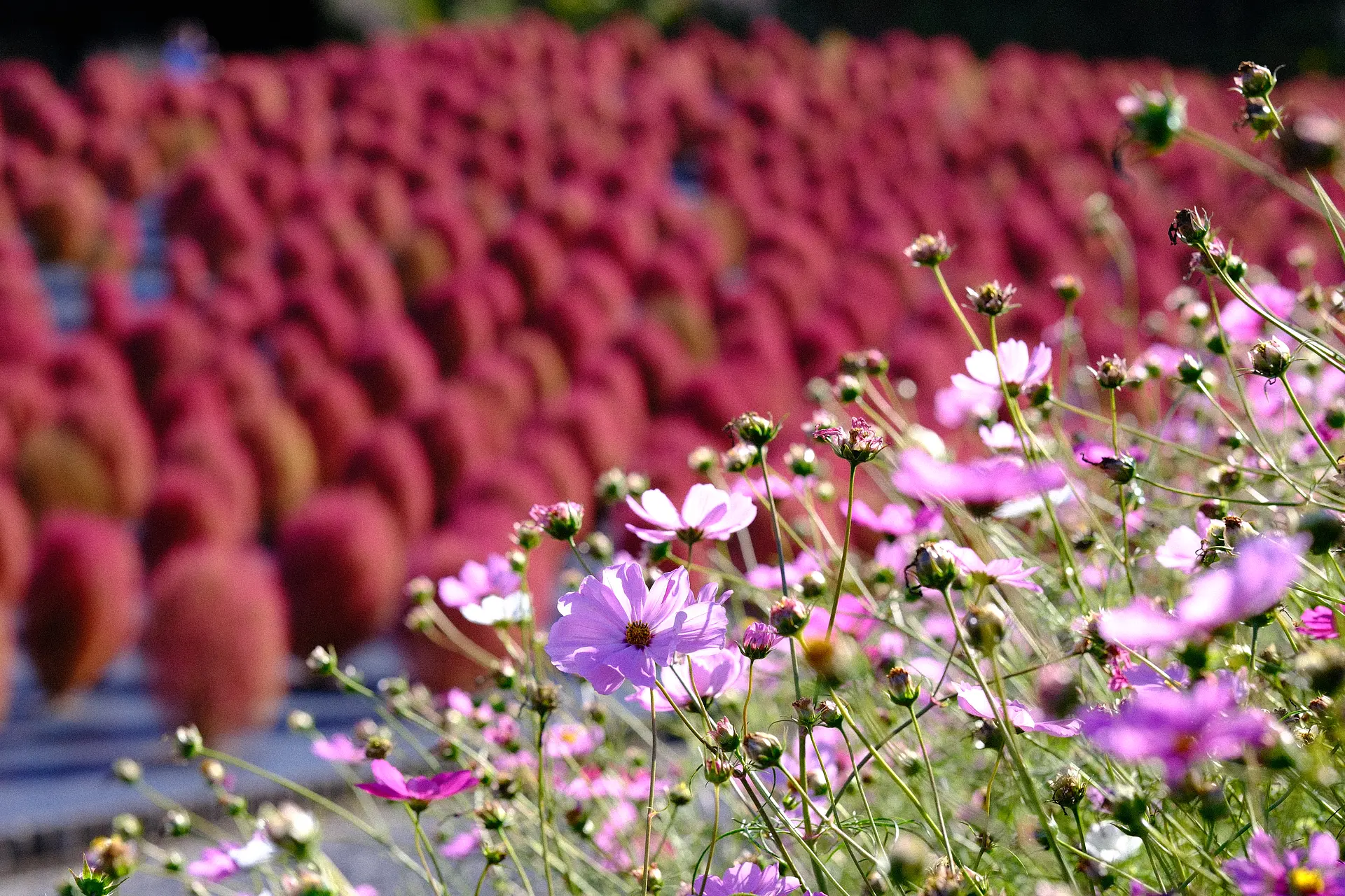 また、志摩市観光農園にはコキアも植えられており、これから少しずつ赤く染まるコキアとともに咲き誇るコスモスのコラボレーションも見応えあり!