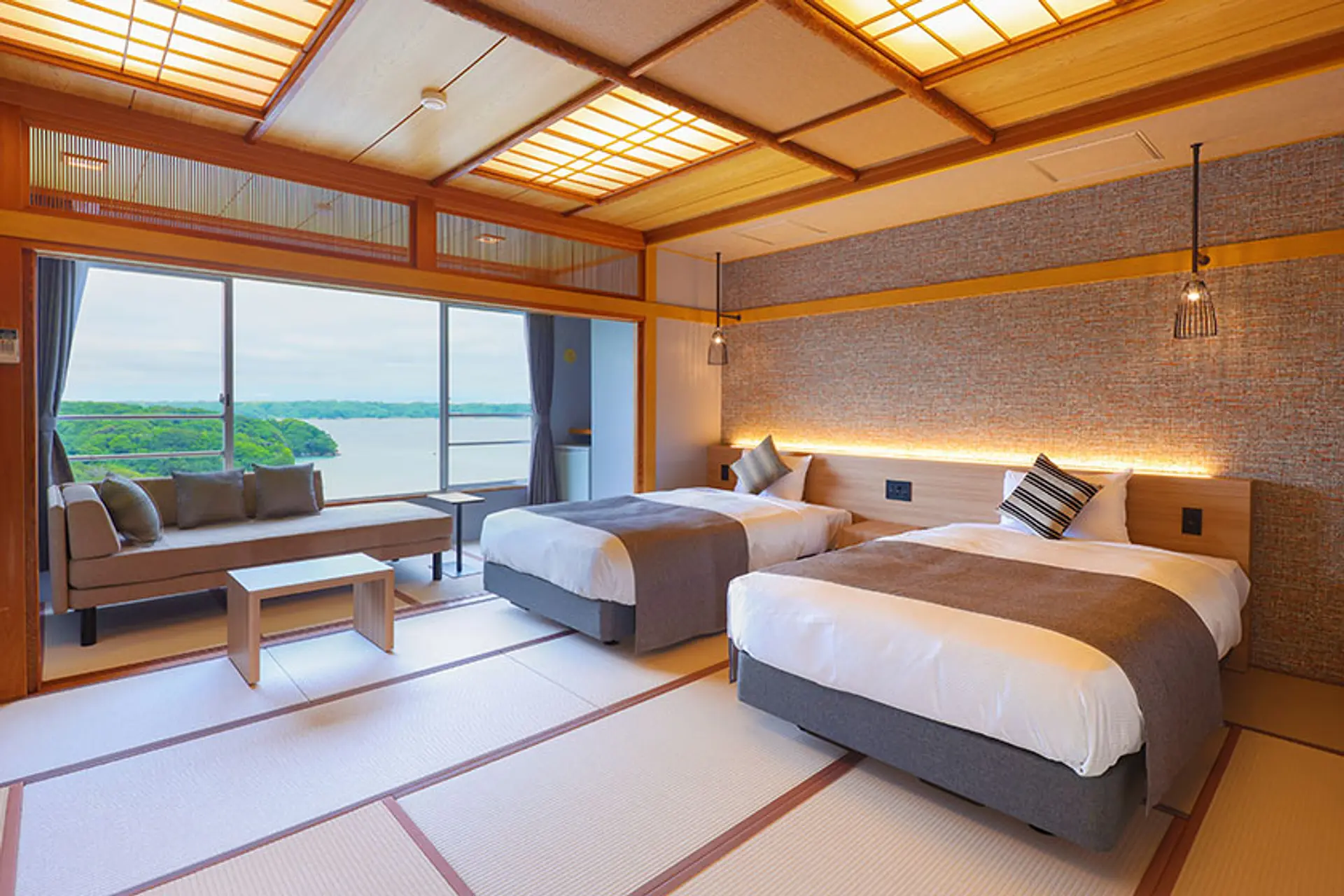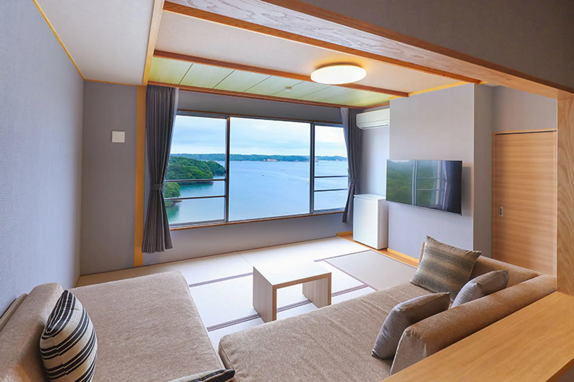 続いてゆっくりくつろげるお部屋をご紹介します。お部屋は英虞湾が見渡せるオーシャンビューな海側のお部屋がオススメ!落ち着きのある和ベッドルームでゆっくり休み、目覚めたら窓の外には絶景!最高の朝を迎えられますよ!