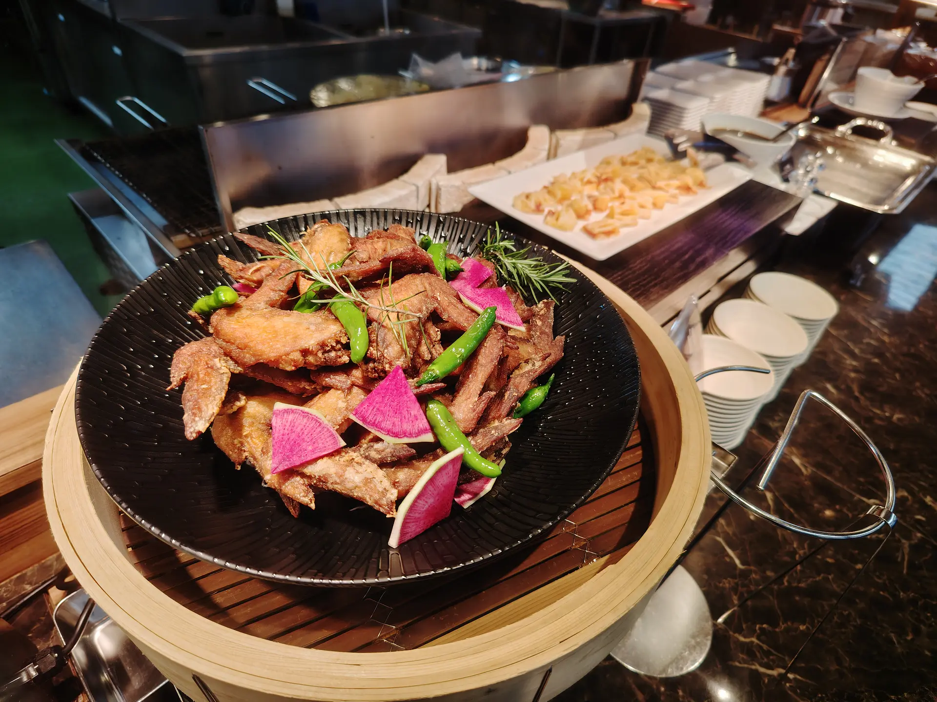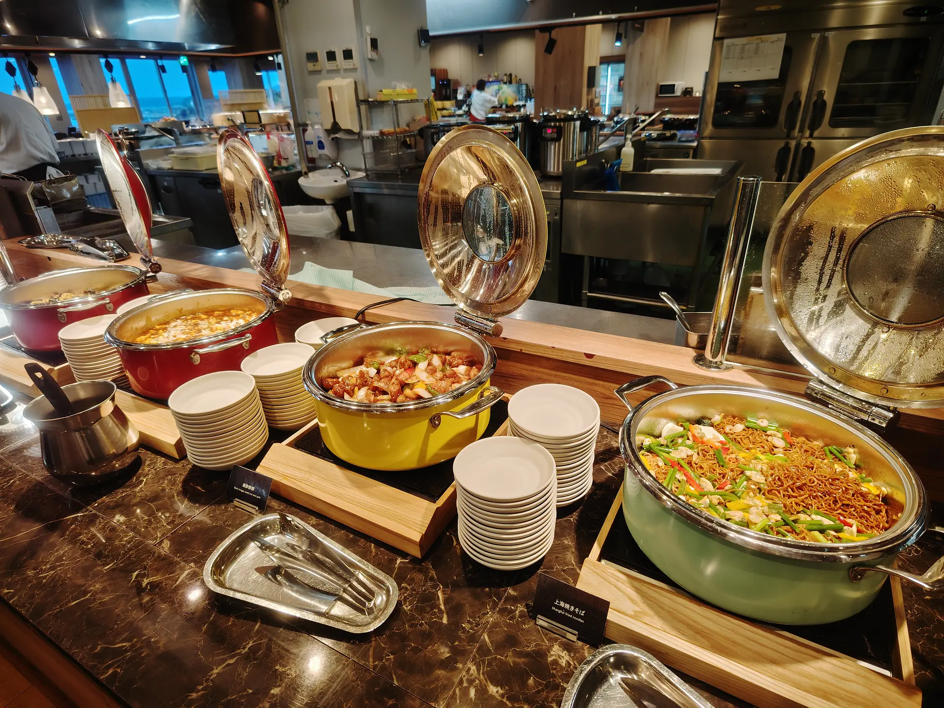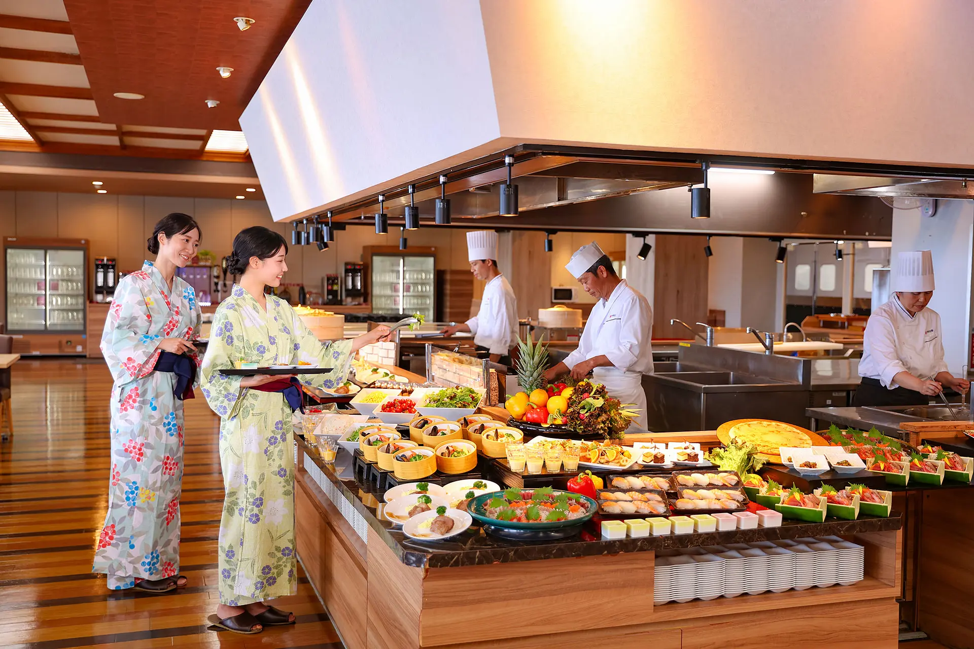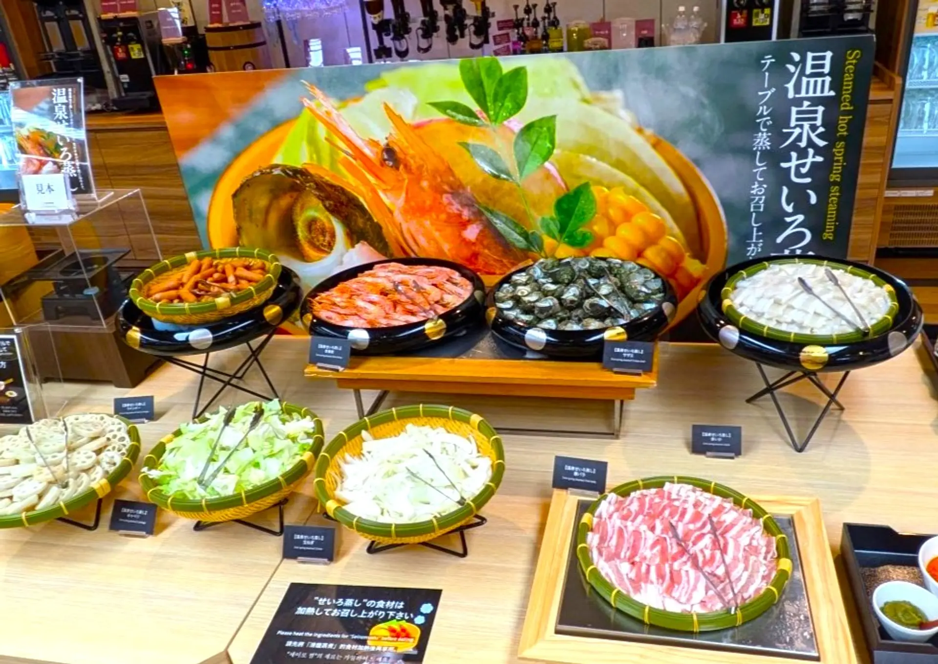 食事は英虞湾が一望できるレストランでバイキング!臨場感あふれるライブキッチンから出来立てのお料理を堪能できます。夕食バイキングでは、お刺身や漁師鍋、伊勢志摩産あおさ海苔を使用したかき揚げなど海鮮料理を中心に和洋中の豊富なメニューが並びます。季節の料理として今年の秋冬はシンガポール風ガイトートや寒い時期にぴったりのもつ鍋なども登場しています。各テーブルに置かれたかまどで温める「温泉せいろ蒸し」は、食べる前からワクワクが止まりませんね!