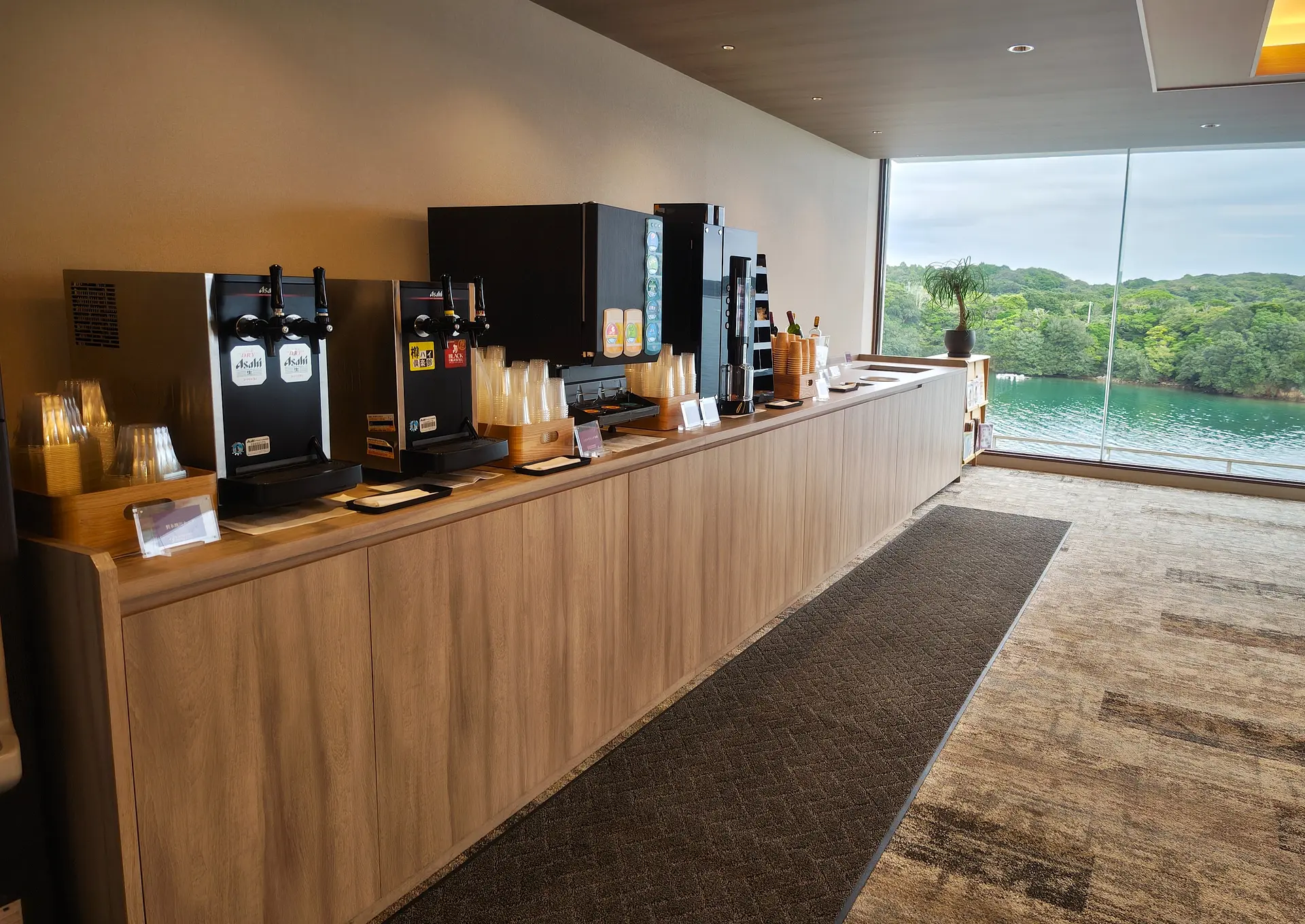「大江戸温泉物語Premium伊勢志摩」に到着して最初に目を奪われるのが、上質なプレミアムラウンジ。ソファやテーブルがゆったりと配置され、英虞湾の美しい景色を眺めながら、のんびりくつろげる空間になっています。 アルコールやソフトドリンク、アイスキャンディーなども無料で楽しめ、滞在中に何度でも利用することができます。