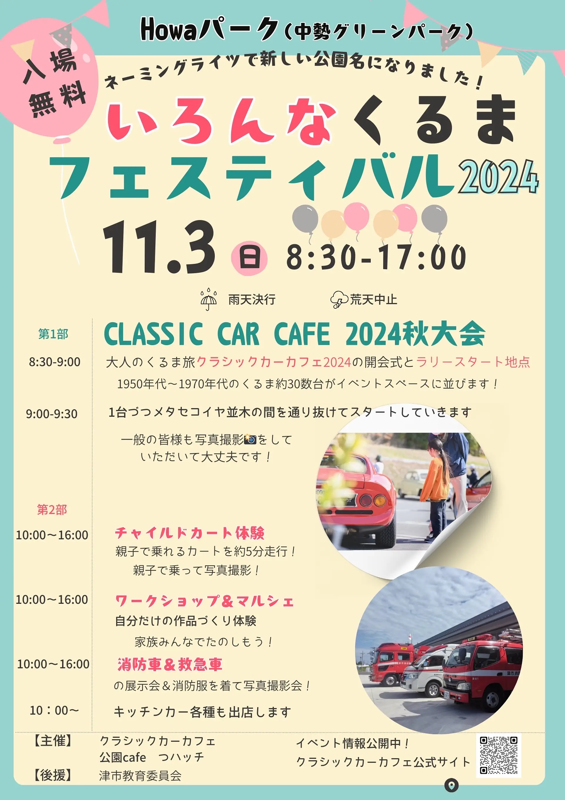 ちなみに、スタート地点の「HOWAパーク(中勢グリーンパーク)」では、当日「いろんなくるまフェスティバル2024」が開催されています。スタート前のクラシックカーだけでなく、消防車&救急車の展示 やチャイルドカート体験、ワークショップなど、ご家族で楽しめるアクティビティが盛りだくさんです!ラリーのスタートを見送った後も、「HOWAパーク」内でお楽しみくださいね!またラリーの立ち寄りポイントである名松線「伊勢八知駅」では「みすぎ秋まつり」を開催しています。地元の伝統芸能や消防音楽隊などの各種ステージイベントやさまざまなお店・団体のブース出展などを楽しみながらクラシックカーをご覧頂けますよ!