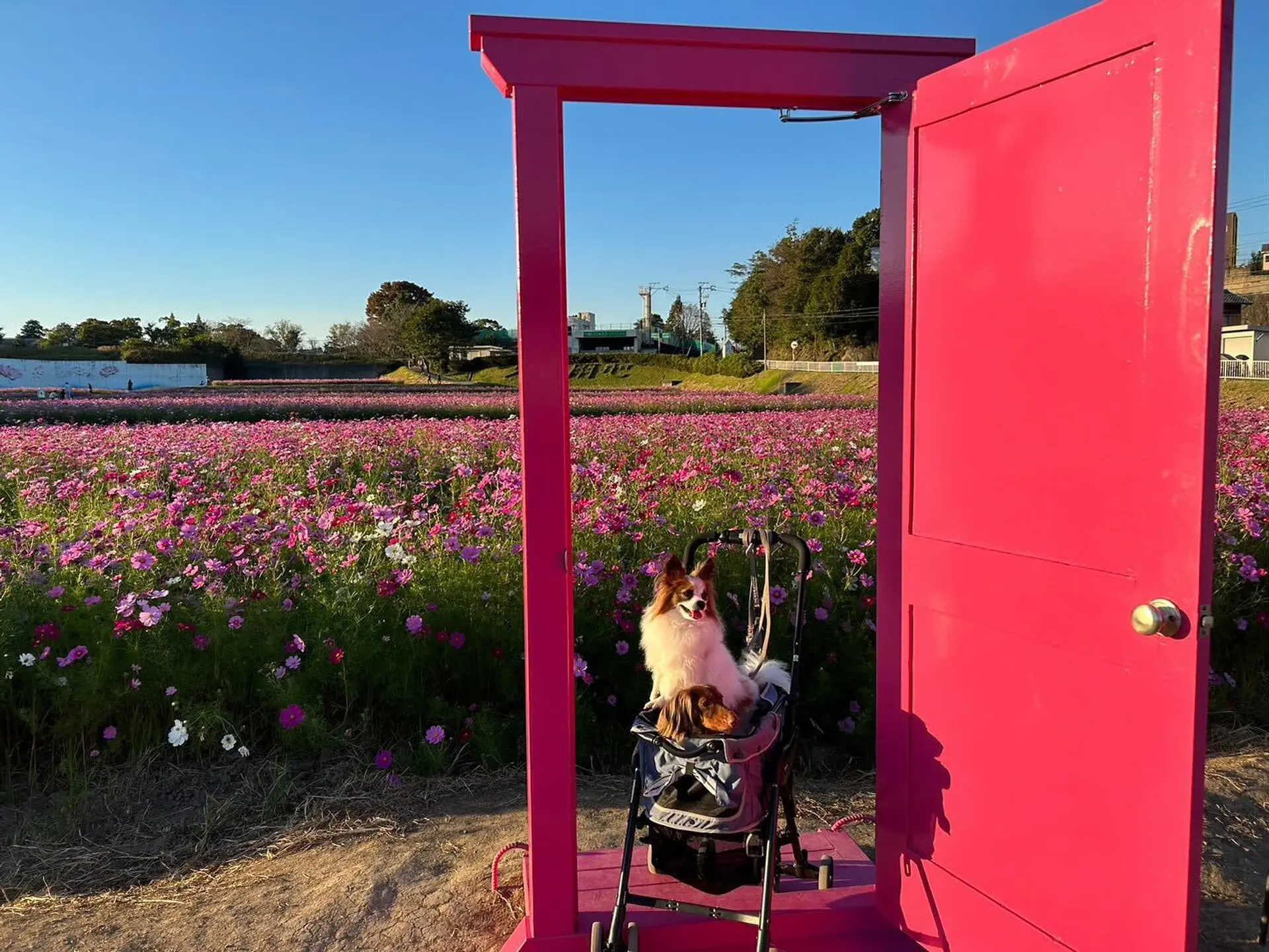 三重県津市にある「とことめの里 一志」は、夏にはひまわり、秋にはコスモスが楽しめるフォトスポットです。花の見ごろ時期には、誰もが知っているどこへでも行けそうなピンクのドアも登場し、子供や愛犬を連れた家族が素敵な写真を撮って楽しんでいます。