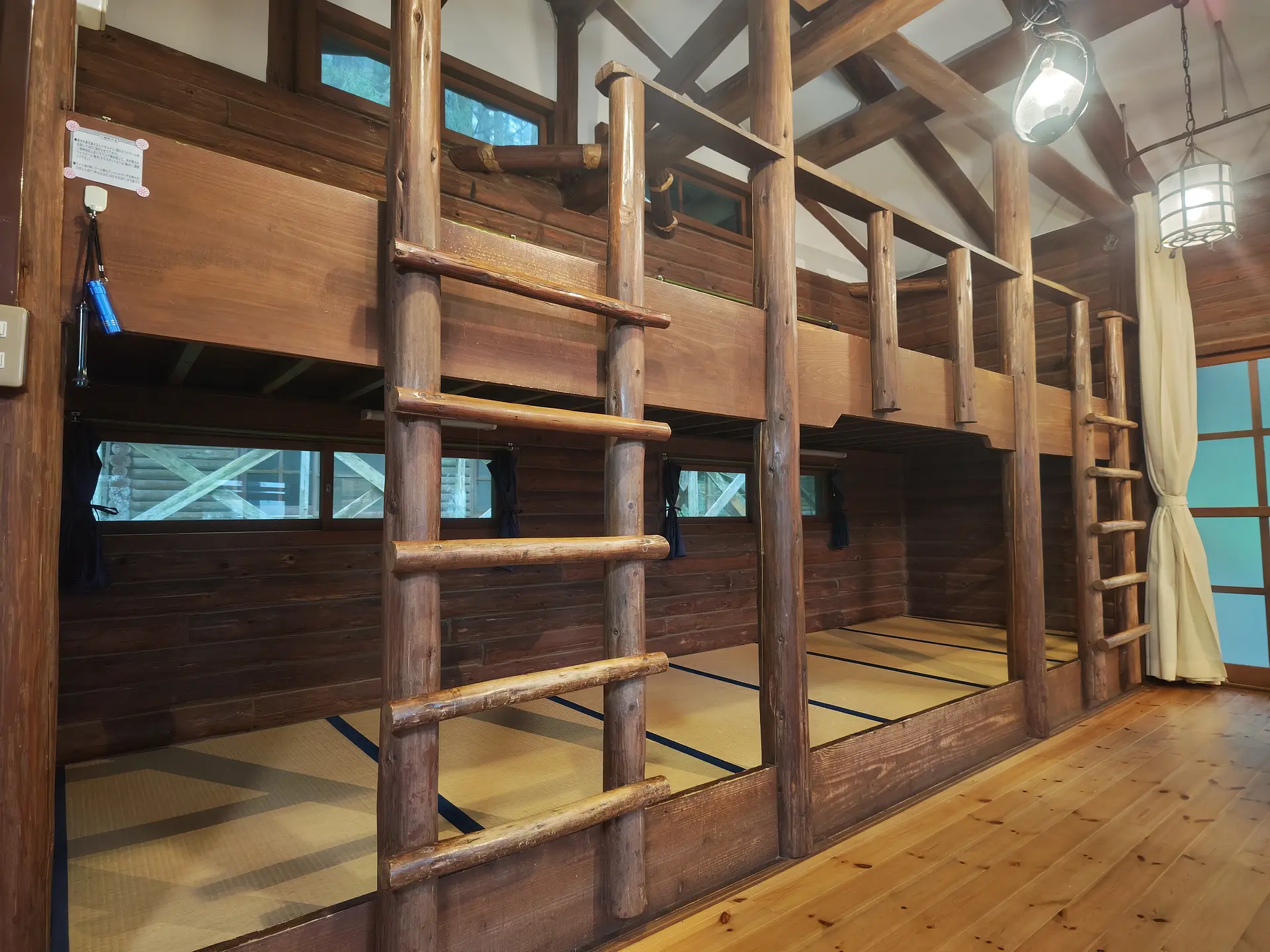「わかすぎの里キャンプ場」のログハウスは3棟あり、それぞれに大きな2段ベッドがあります!子供たちの思い出に残るログハウスですよ!さらにトイレ、キッチン、エアコン、Wi-Fiも完備!
