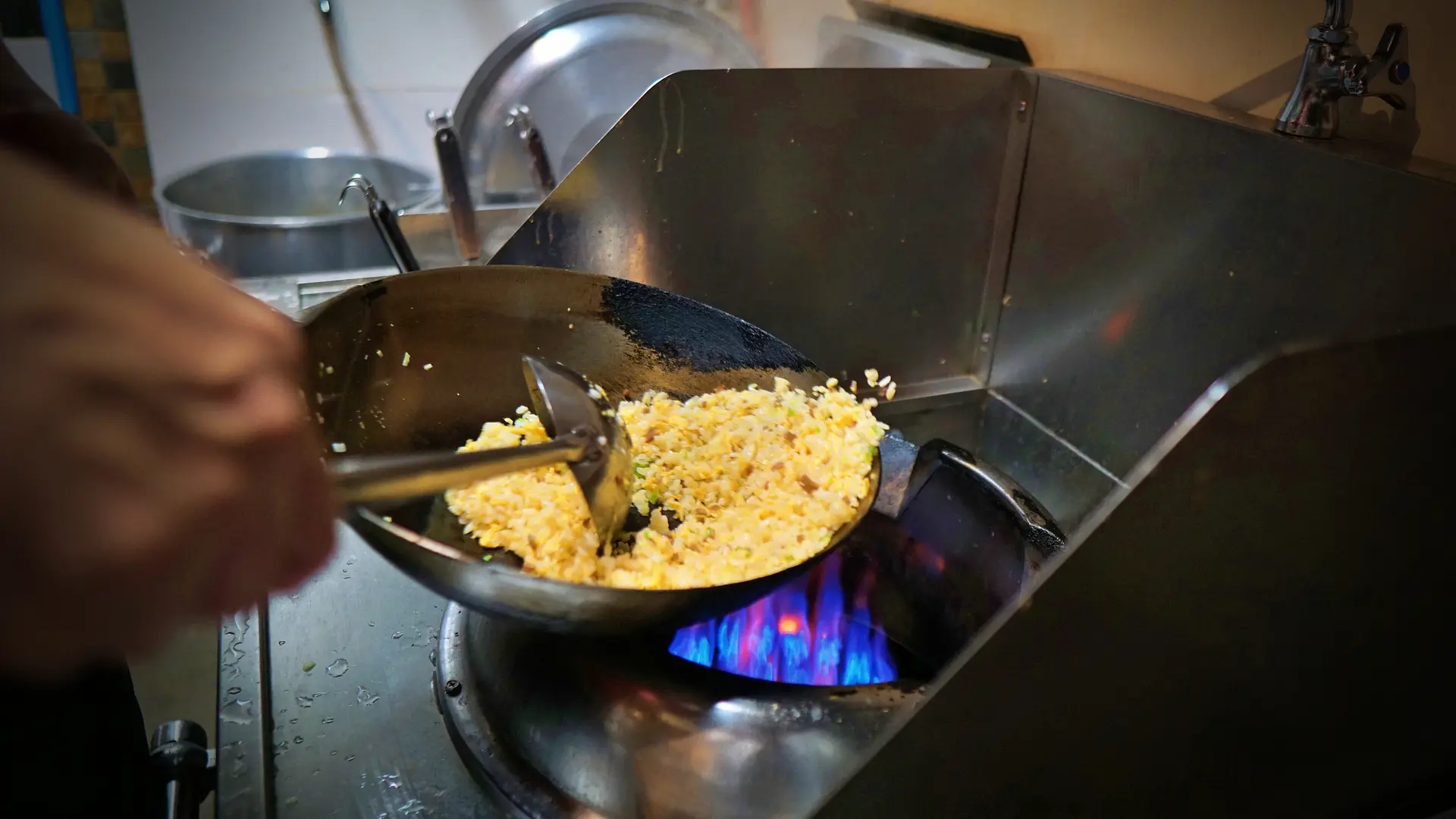 一般的には、炒飯を作る際には卵、ご飯、具材の順で炒めていくのですが、ここにも大将が探究した手順があり、卵、具材、ご飯の順で炒めていきます。