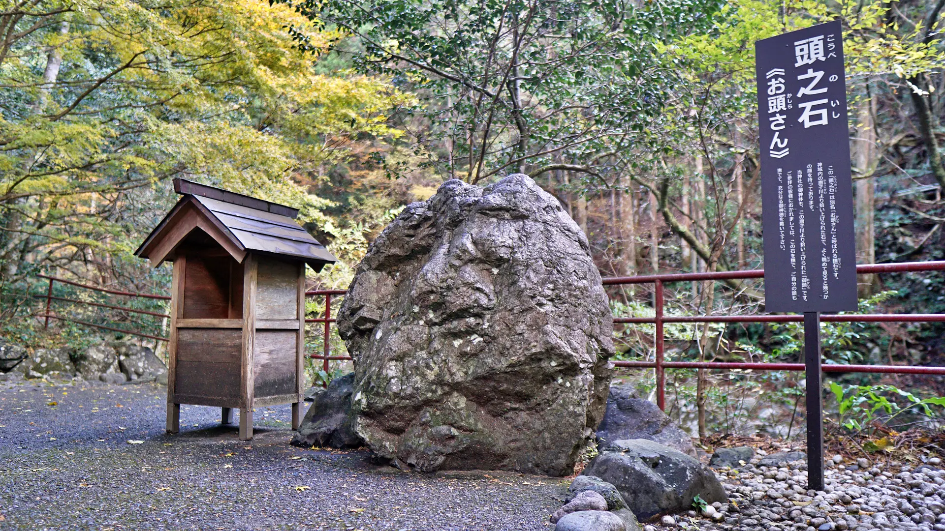 おかしらさんはその知恵の水の近くにあり、何人もの人の顔のように見える不思議な石で、なでると御神力を頂けます。