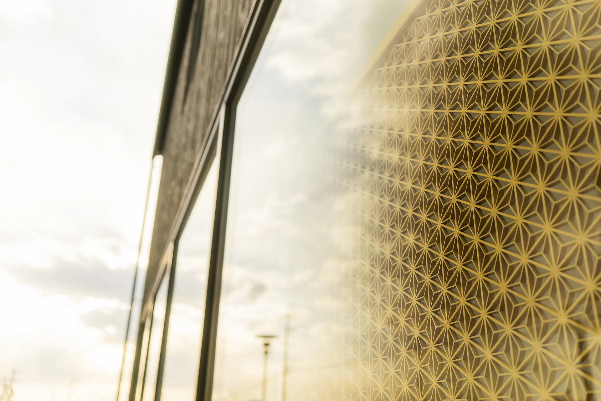 美しく繊細な幾何学模様。写真は、JR関西本線「新堂駅」前にある「SHINDO YARDS図書館 BOOKMARK STORAGE」隣の北伊勢上野信用金庫ショーウィンドウに飾られている馬場さんの組子作品です。三種類の大きなアートは、圧巻の美しさ!
