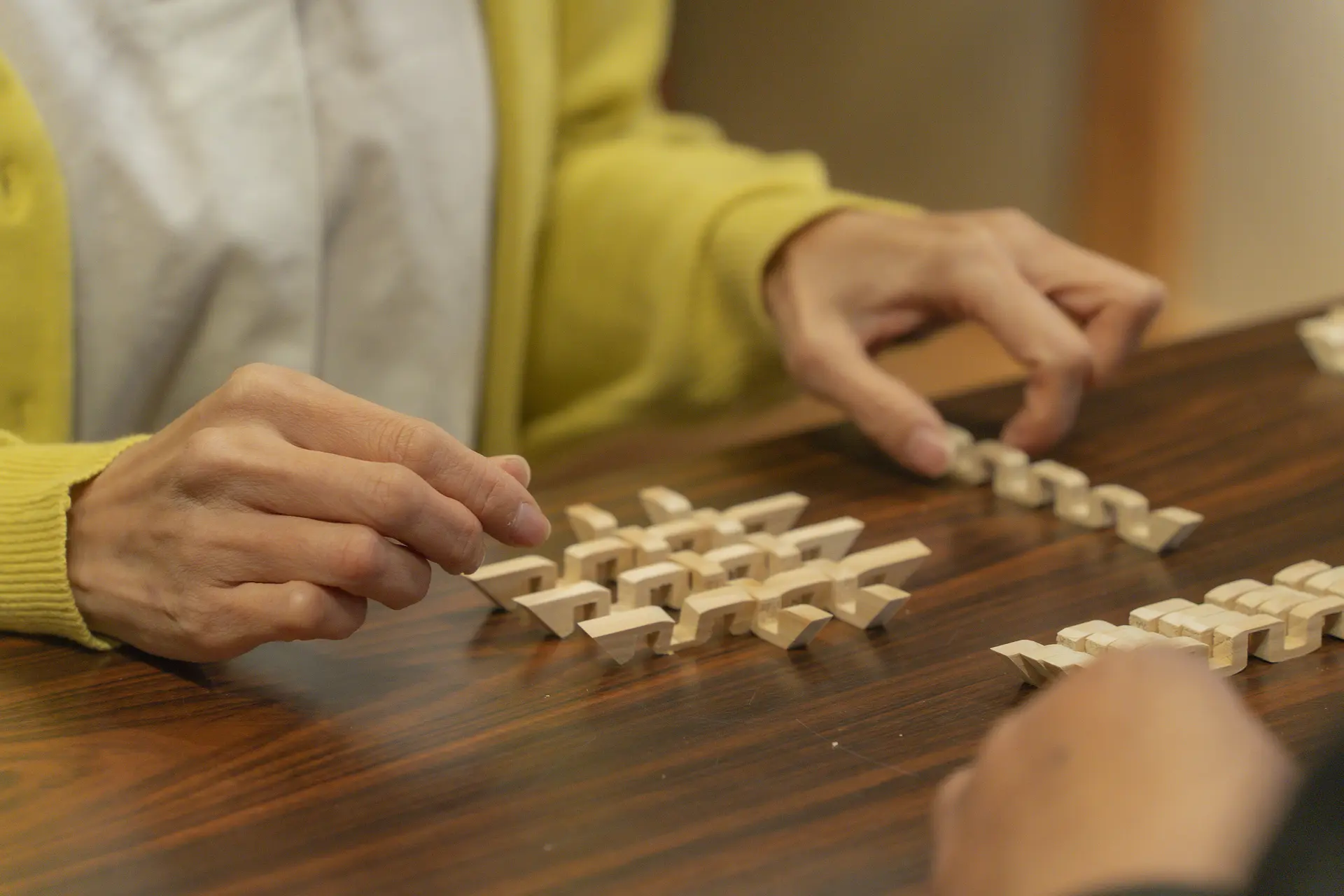 凹凸のある棒状の材料を、縦と横に組み合わせていきます。匠の技で作られたヒノキのパーツが、パズルのようにきれいにはまっていきます。
