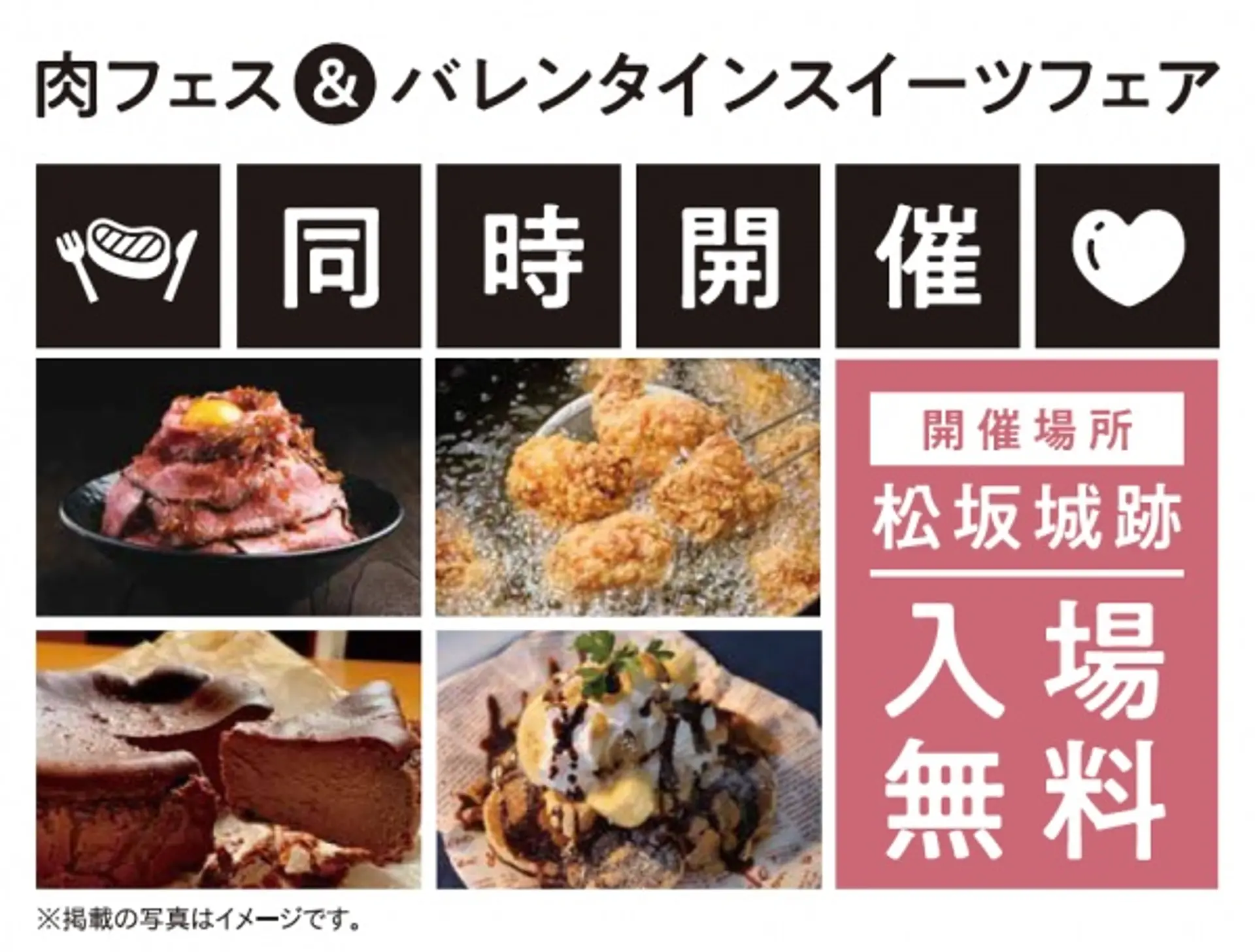 「松坂城跡」の入場無料エリアに「肉フェス&バレンタインスイーツフェア」としてグルメブースを展開、お肉をメインの食材にしたキッチンカーやバレンタインスイーツのお店が多数出店予定です。