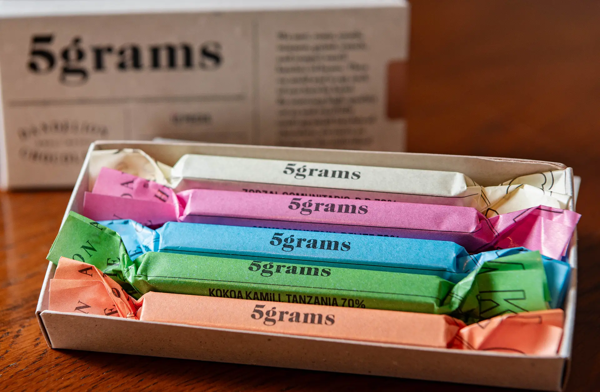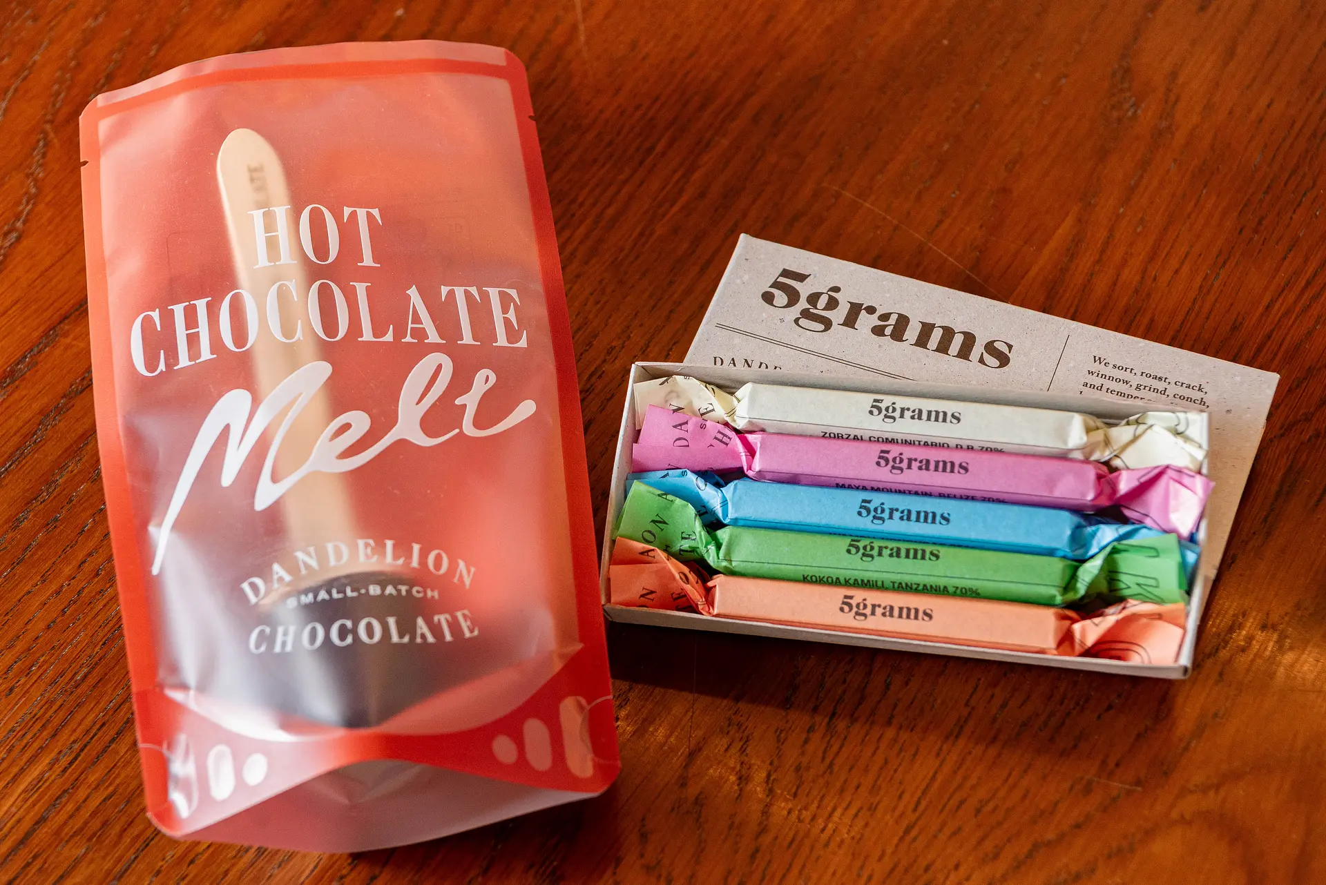 産地の異なる5種類のカカオ豆とオーガニックのきび糖だけで作るチョコレート「5grams」と、温かいミルクに溶かして手軽にホットチョコレートが味わえる「ホットチョコレートメルト」の2種類。