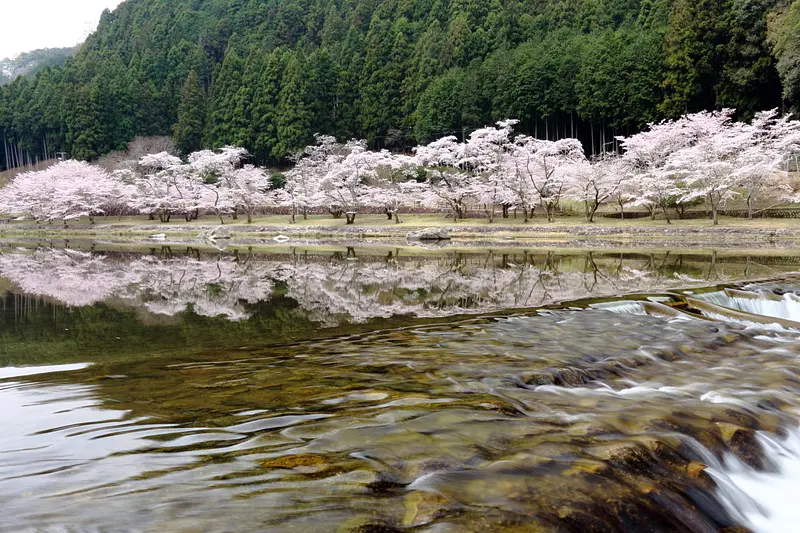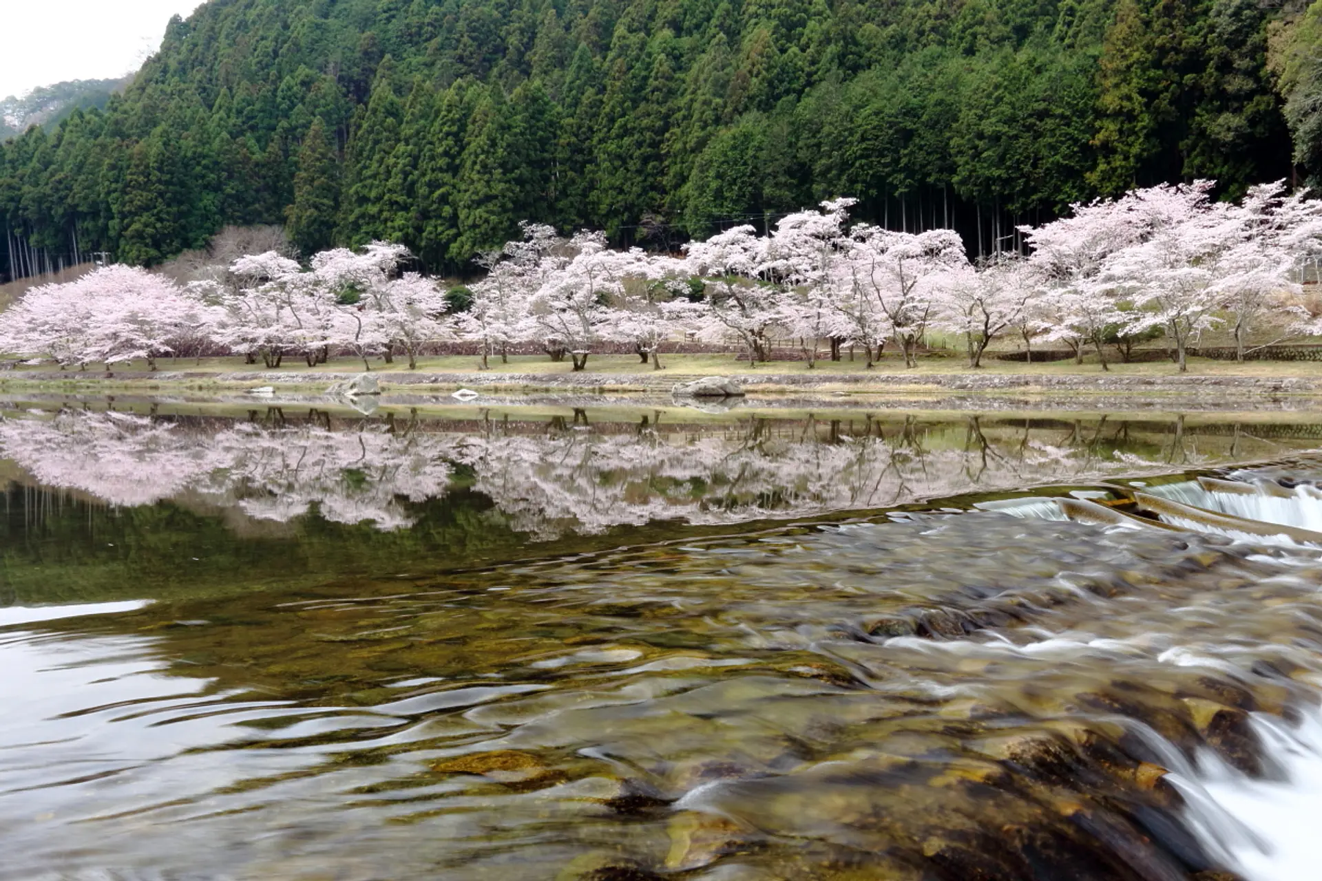 周辺には茶畑や水田もあり、桜のピンクと茶の緑や水田に映る桜、また、開花のタイミングが合うと黄色のミツマタも一緒に楽しめるスポットです。