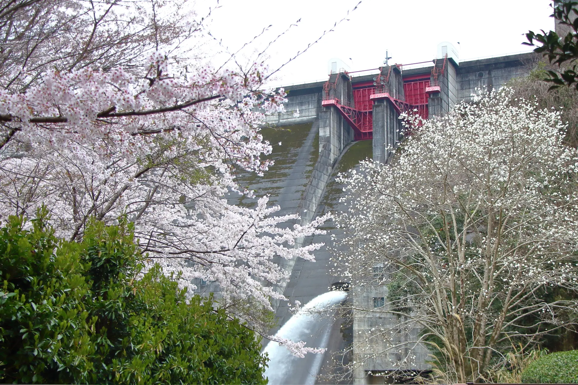 ダムの上(堤頂管理用道路)からは素敵な景色を眺めることができ、さらに上流側に約1km先の君ケ野ダム公園では散策して桜を楽しむことができます。