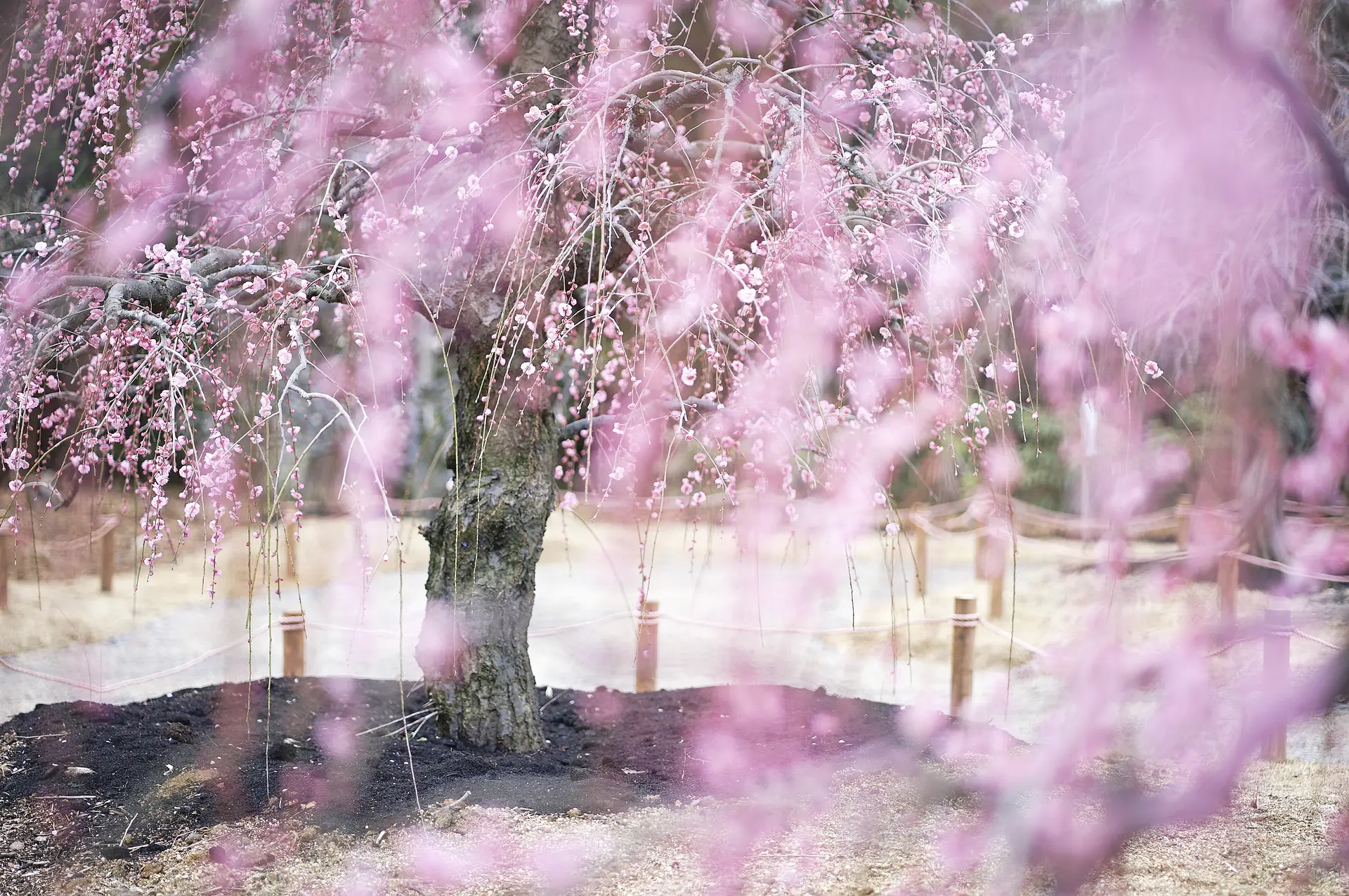 また、周りのロープがピンク色なので、しだれ梅を柔らかく包み込むように見えて、写り込んでも綺麗なところがポイントです…!