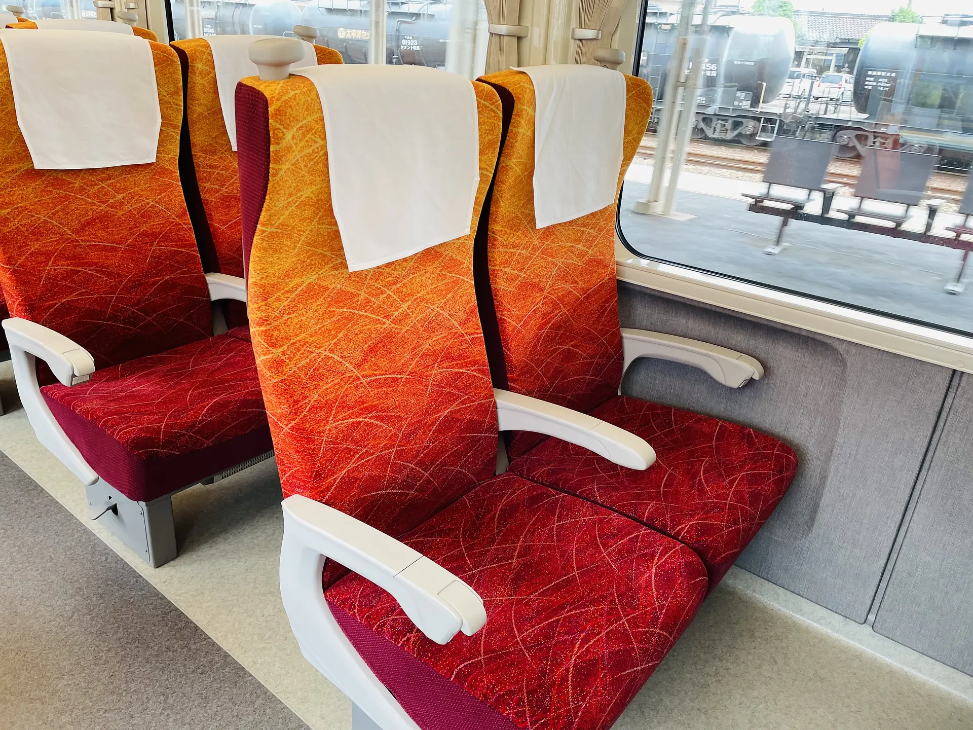 座席の色彩は、沿線の紅葉や花火などをイメージした明るいデザイン。全席にコンセントが設置されており、無料Wi-Fiも利用可能なので、快適な時間を過ごすことができます。