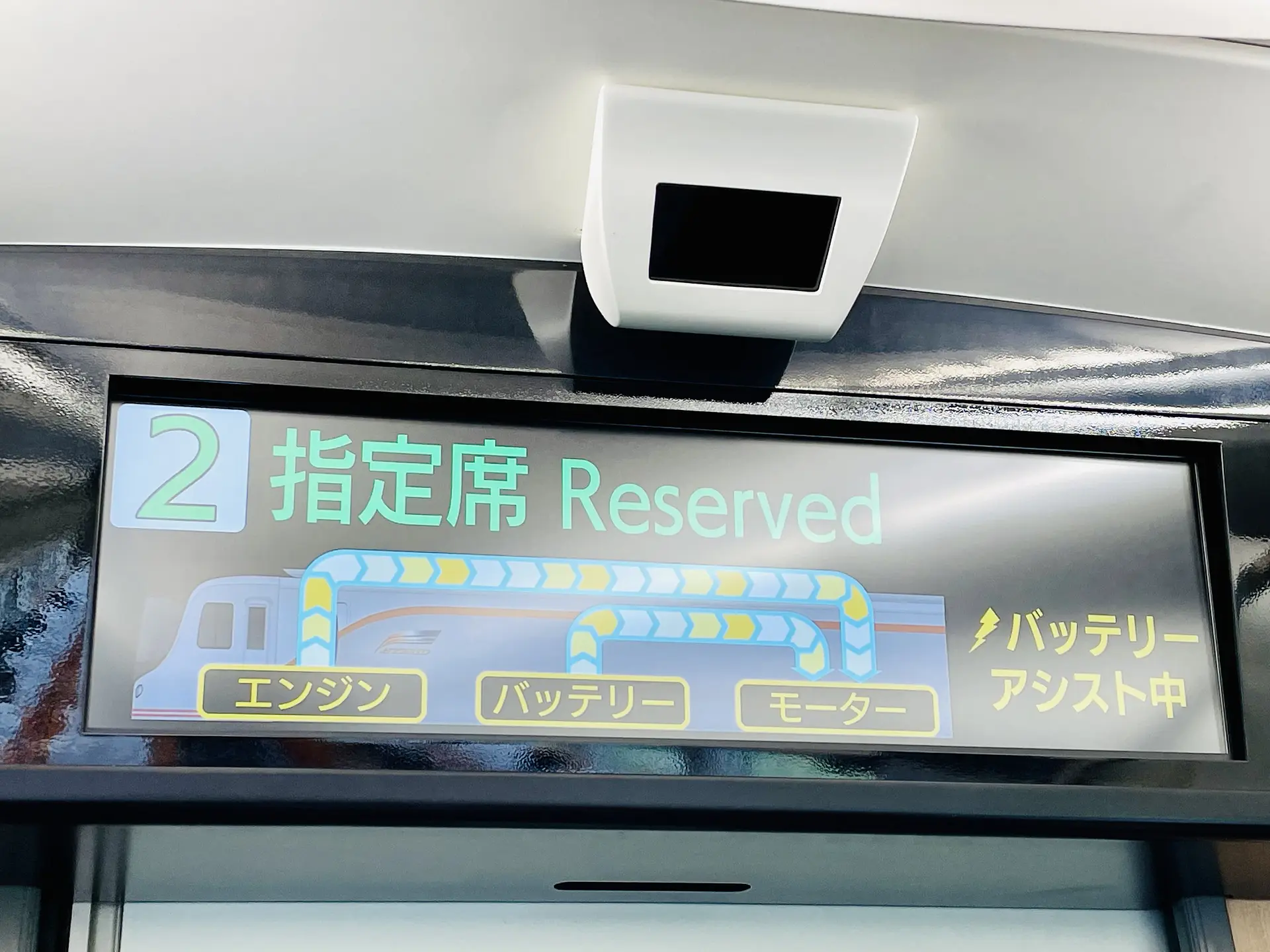 車内のディスプレイにはエンジンとバッテリーの稼働状況が表示されています。リアルタイムでハイブリッドシステムを体感することができます。