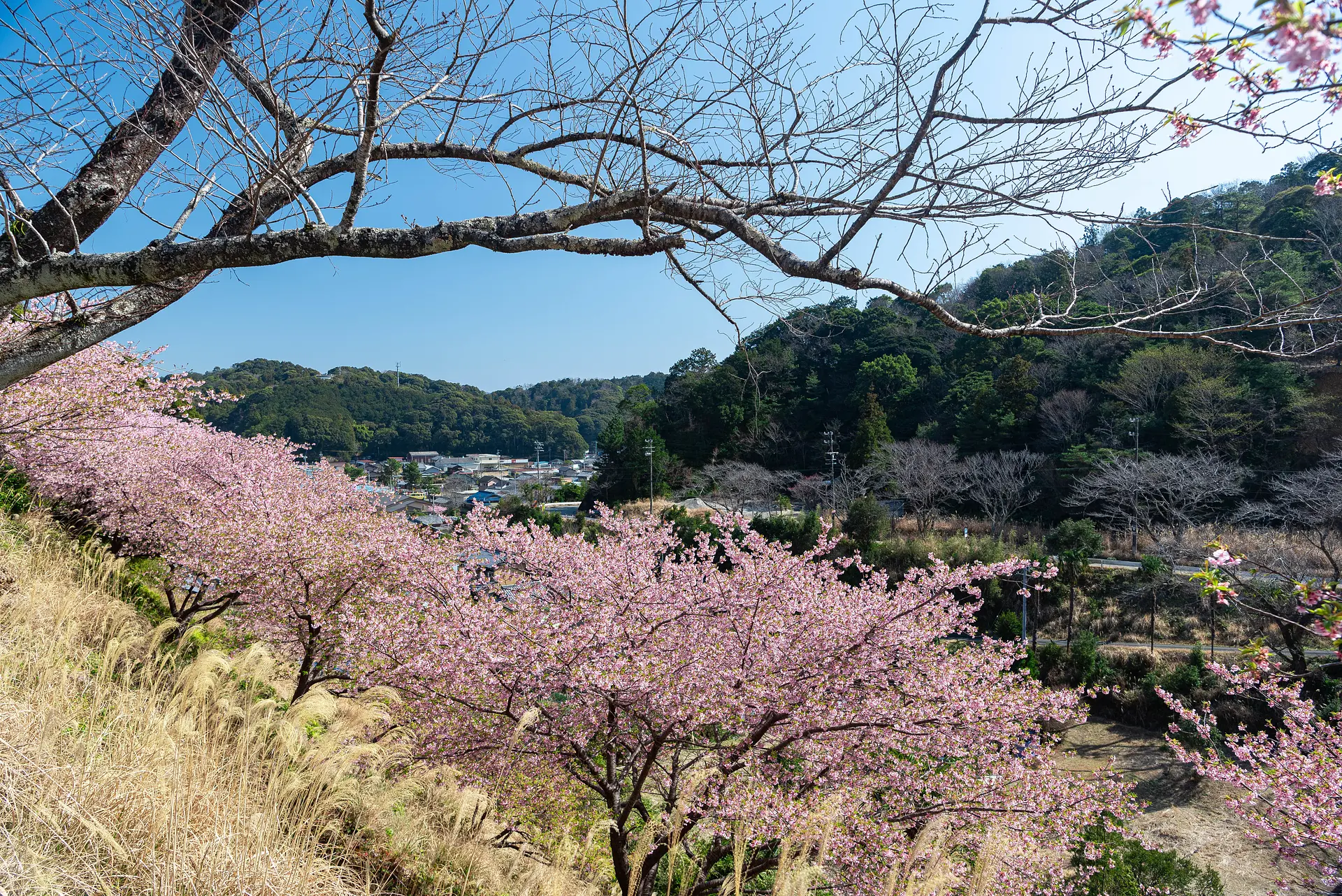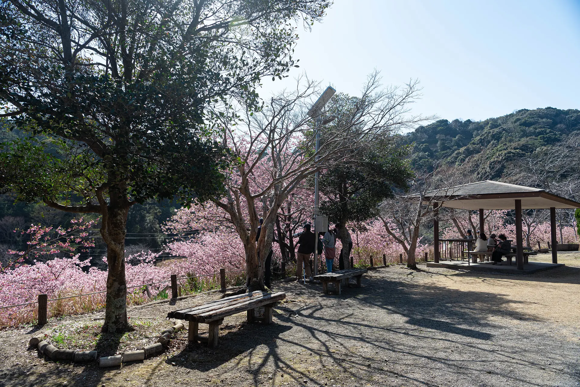 毎年2月中旬から3月上旬になると、公園から見下ろす斜面一面に河津桜が咲き誇ります。