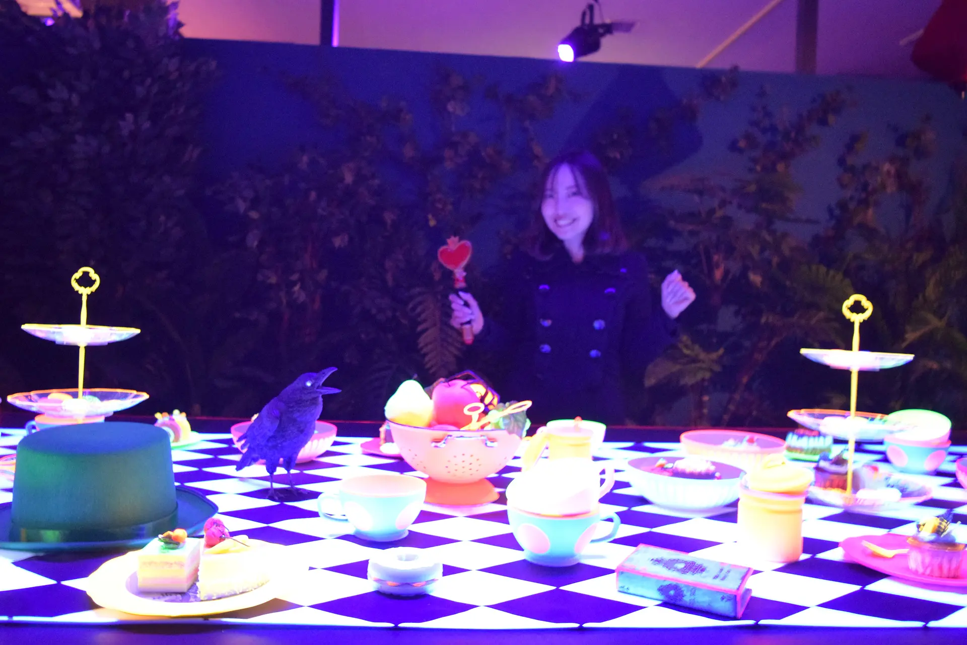 私が手に持っているのは、新アトラクション「アリス イン ダークランド」のお土産として購入できる魔法の杖。他にも、アリスのキャラクターたちのアクリルキーホルダーやマグカップ、コンパクトなどが新登場しました。