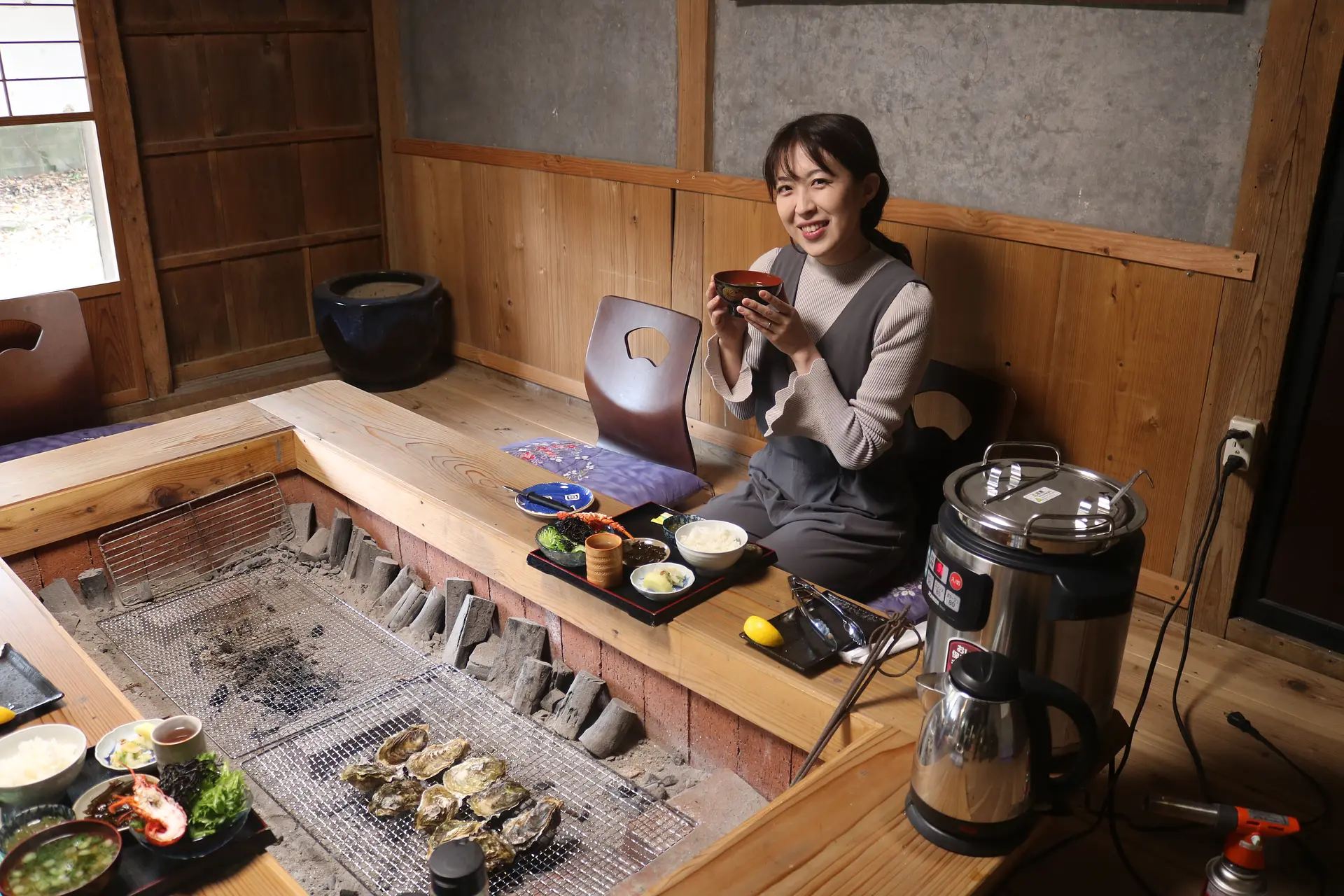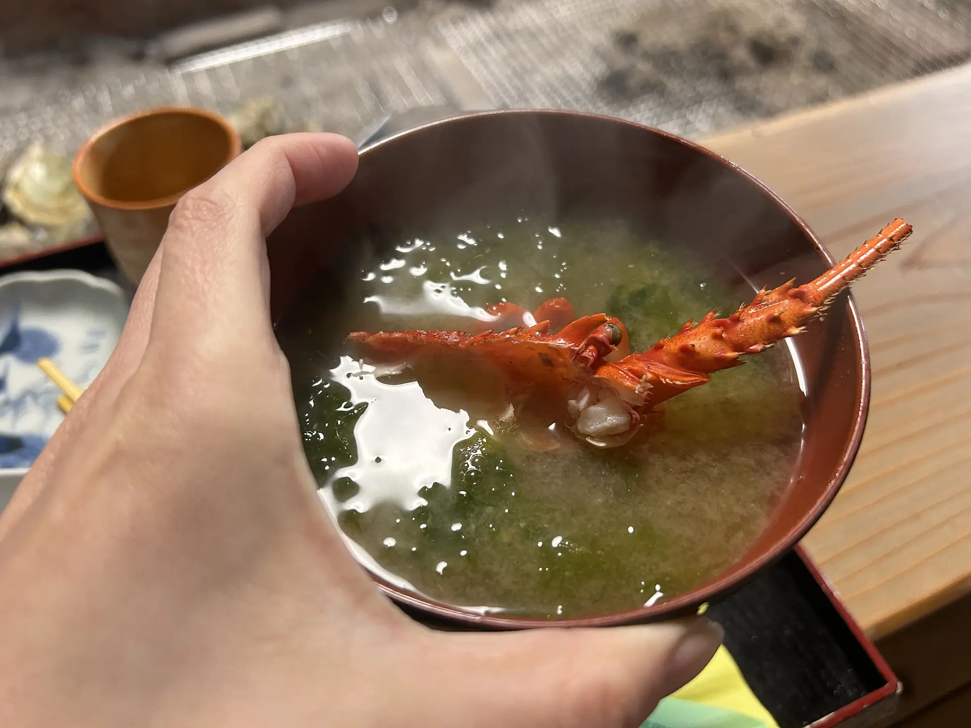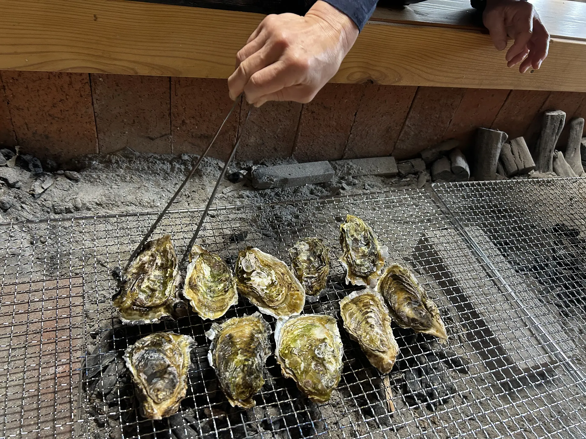 伊勢海老とひじきのサラダもとても美味しく、旬の浦村牡蠣も炭火で焼いていただきました。