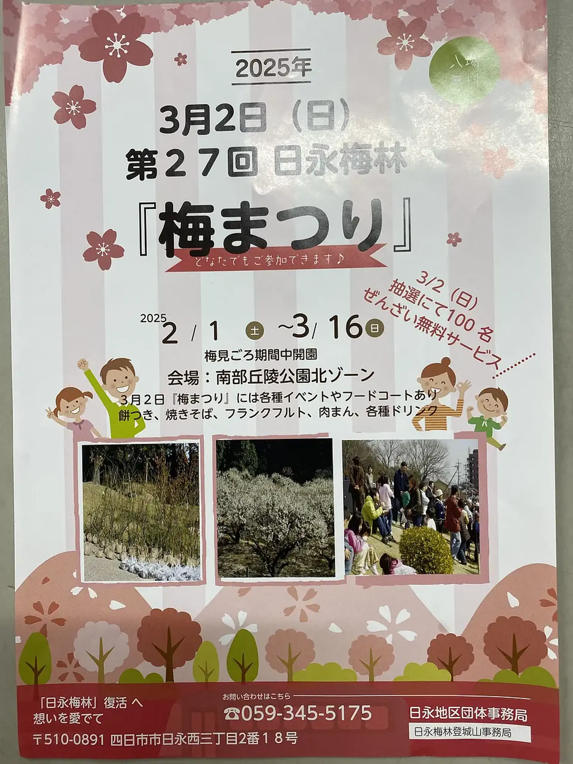 今年も梅まつりが3月2日(日)9時45分から14時まで開かれます。当日は、保育園児の太鼓の演奏や日永つんつく踊りの披露があり、抽選で100人につき立て餅入りぜんざいが振る舞われます。そのほかフリーマーケットの開催、キッチンカー、新鮮野菜の販売もあります。