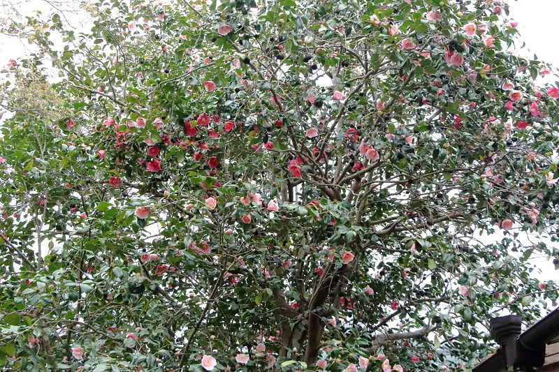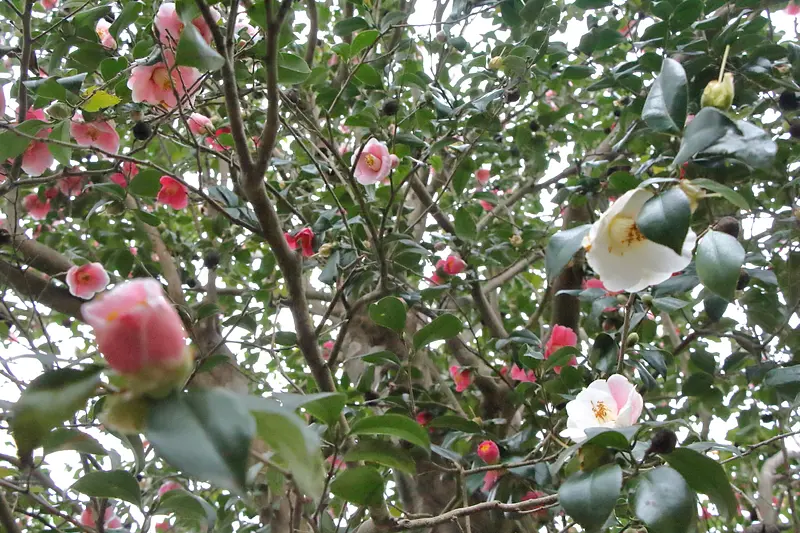 淨得寺の五色椿は樹齢約400年と推定され、高さが約5m,幹回りが約120cmの大きな椿です。
