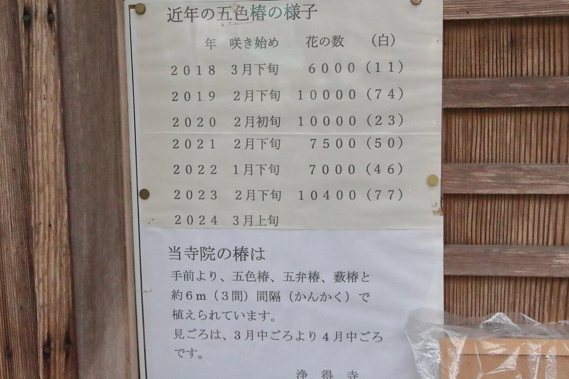 淨得寺では五色椿の花がいつ頃から咲き始めたか、どれくらいの花を付けたかを数えて掲示してくださっています。