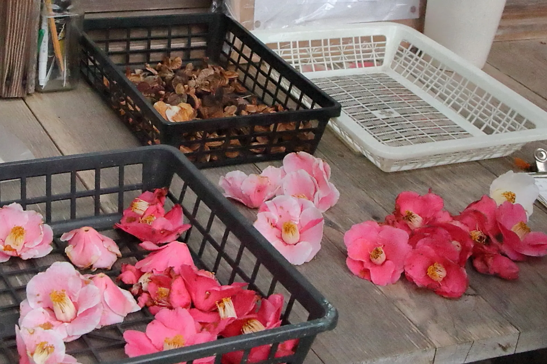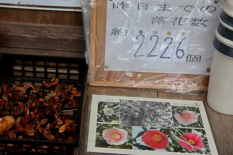 椿は落花する時は花ごと落ちるので、日々、落ちた花の数を数えて前日までの落花数と足し合わせて数えているとのことです。