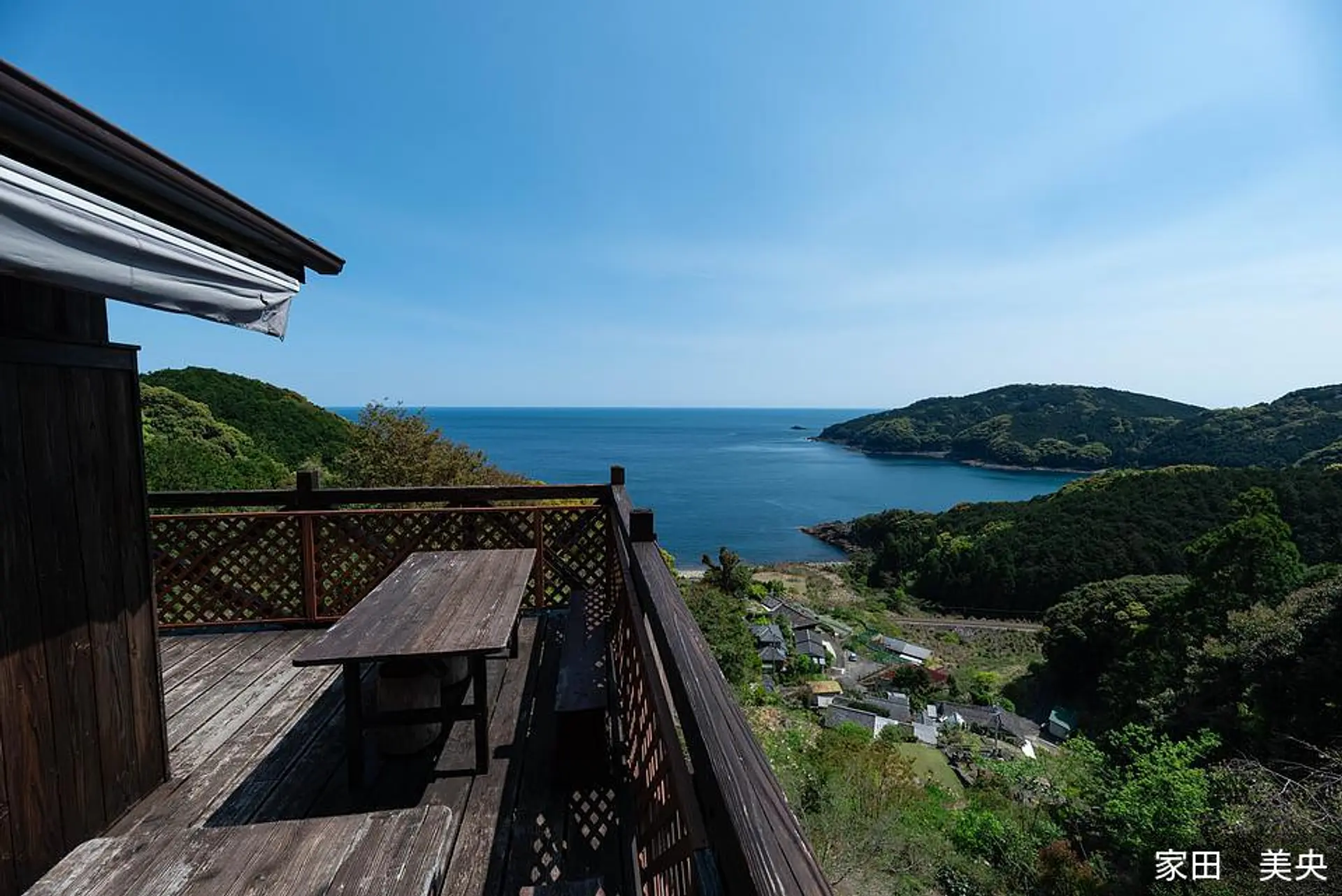 徐福の宮を望む木製テラスから、のどかな波田須の町と熊野灘の絶景を楽しんでください。