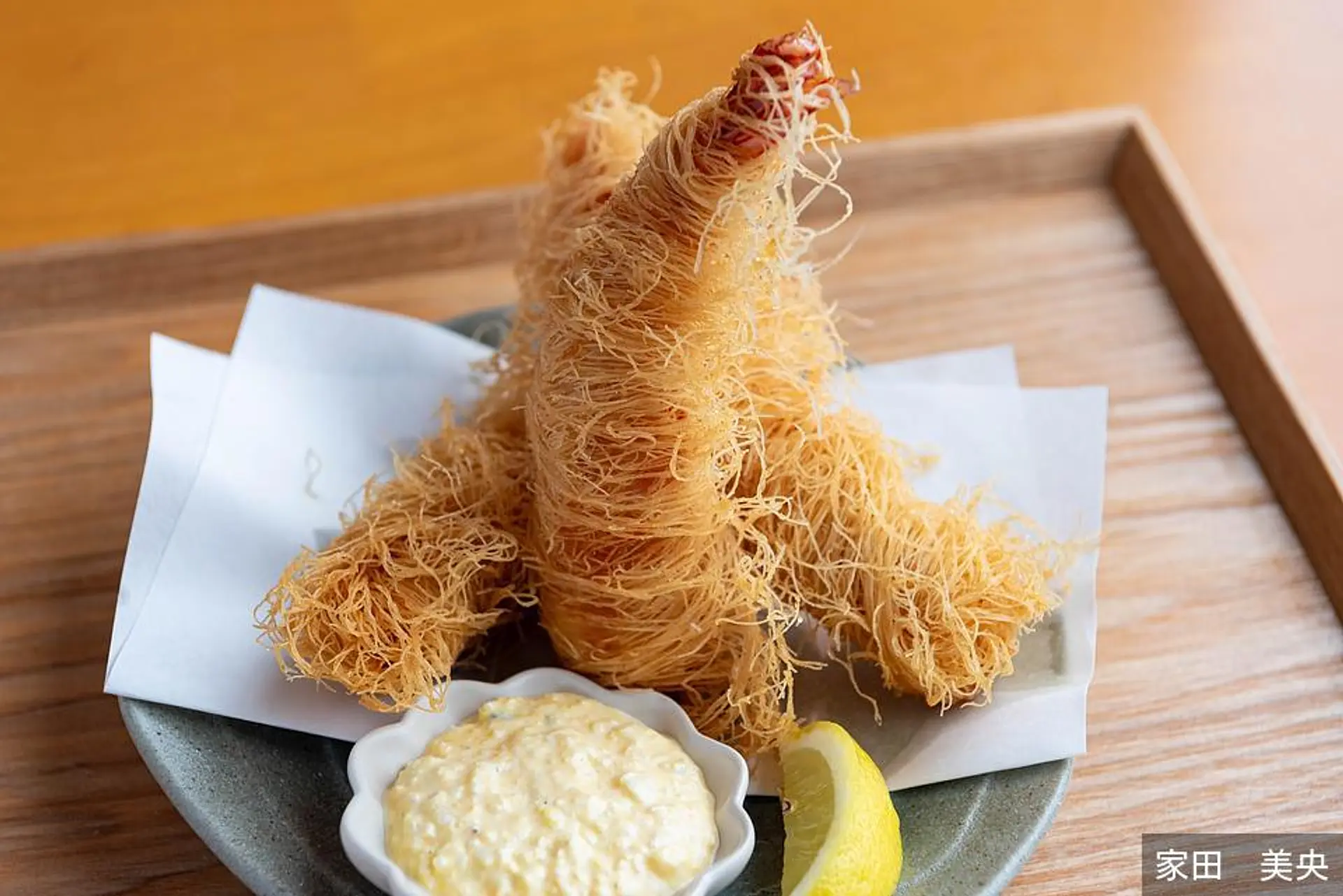 景色が人気なのはもちろん、SNSで話題を呼んでいるのがオリジナルの「カダイフ海老フライ」。