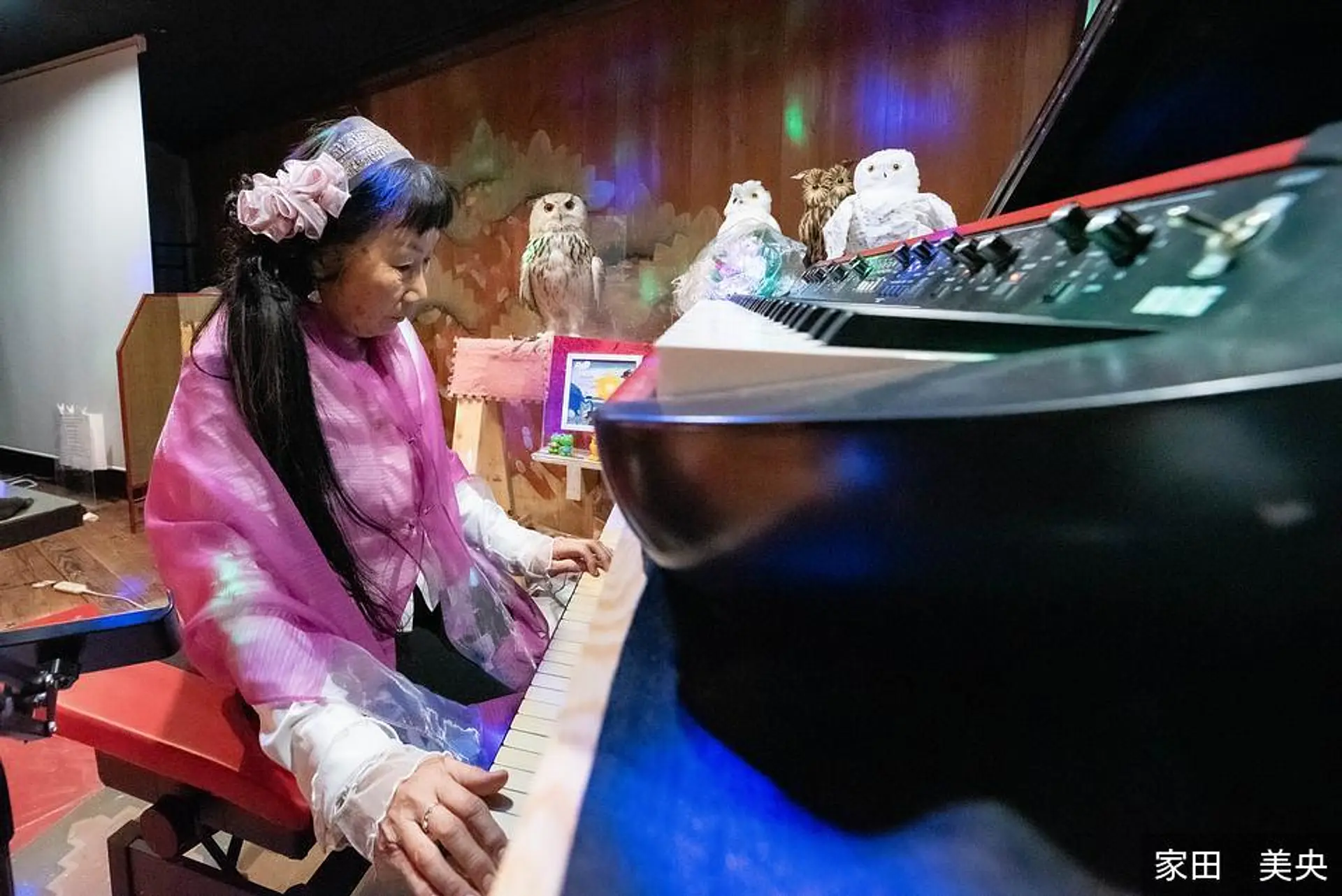 また、ペットのミミズクが宙を舞いながら、矢吹さんの即興音楽が楽しめる、ここでしかできない音楽体験も。