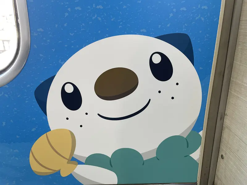 ミジュマルライナーに乗るとドアから早速ミジュマルがお出迎え!座席シートも一部の車両を除き、カラフルなデザインになっているんです!