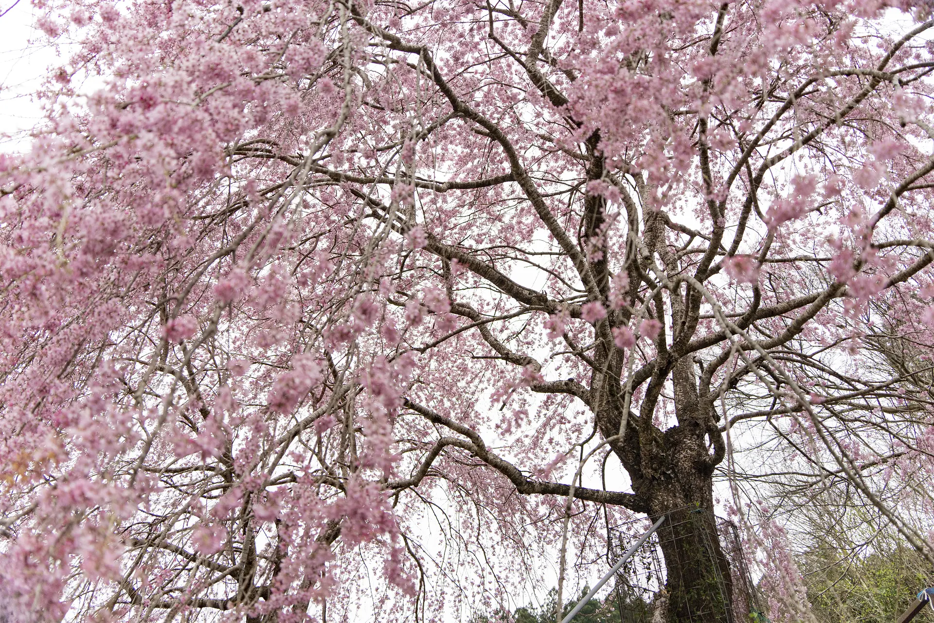 「当地方、一番咲き!」というレトロな看板が目印の「金婚しだれ桜」は、松阪市飯南町相津に突如現れる立派な枝垂れ桜です。ソメイヨシノより1週間ほど早く見頃を迎えます。