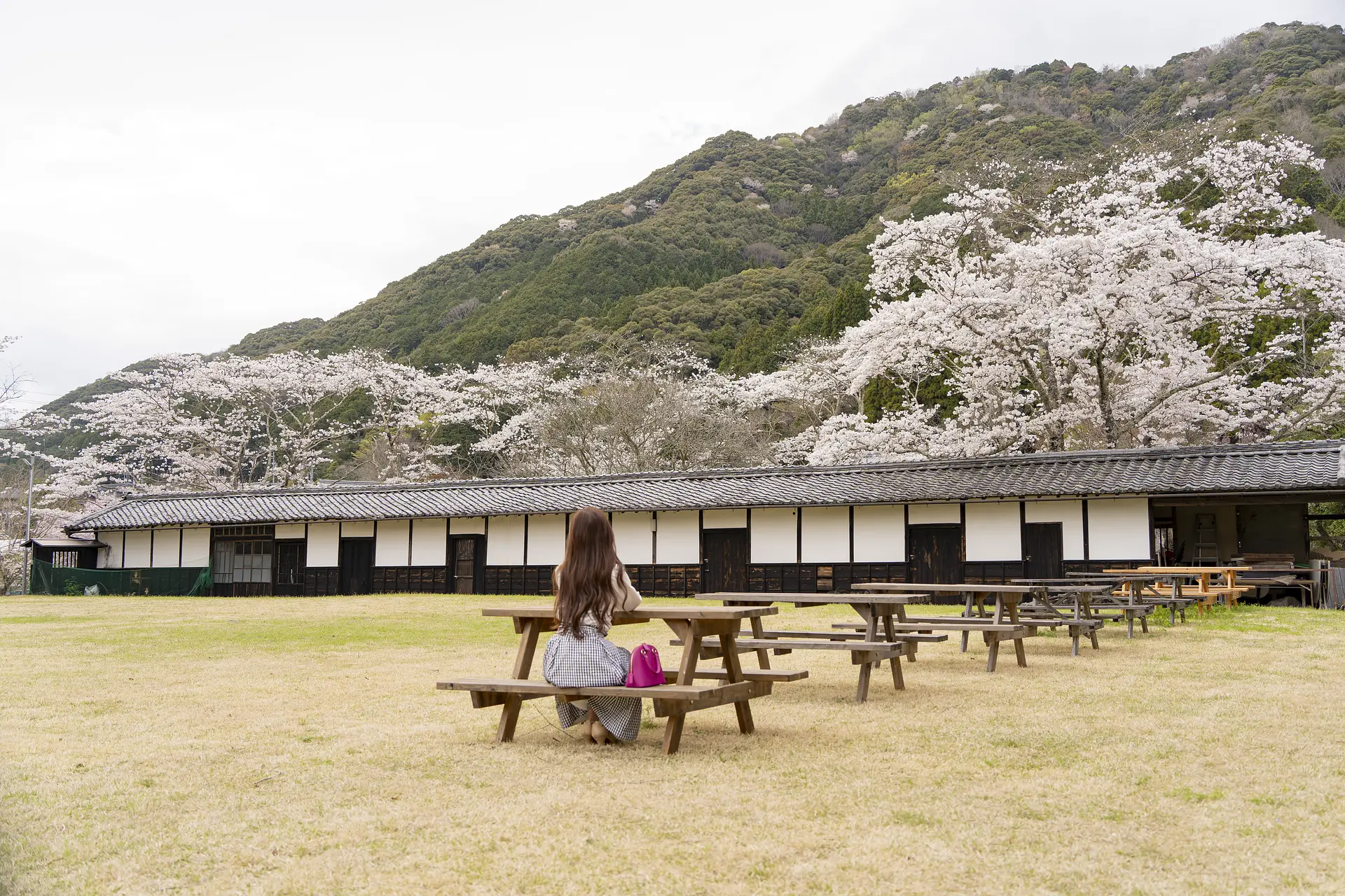 タイムスリップしたかのような明治時代の風情ある建物が今も残る「油田(ゆだ)公園」。周辺の里山の景色と桜、歴史的な建物の共演が見どころです。