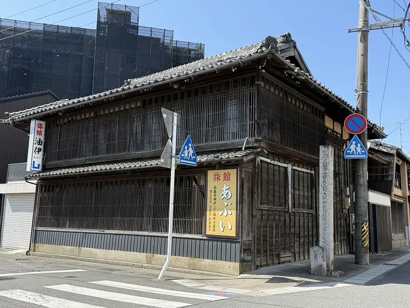 三差路にある「油伊旅館」。部屋の窓が格子状になっており、窓越しに女性の姿が見える設計となっています。