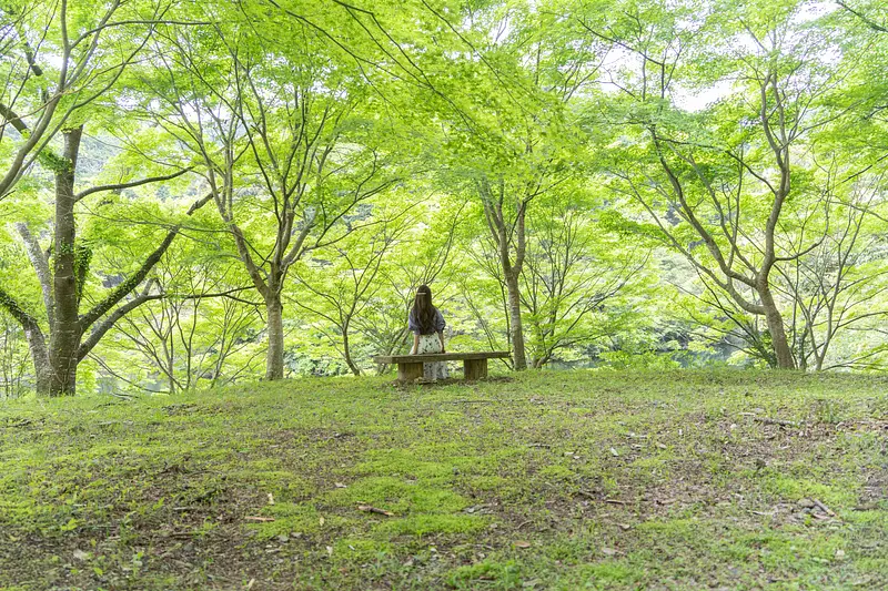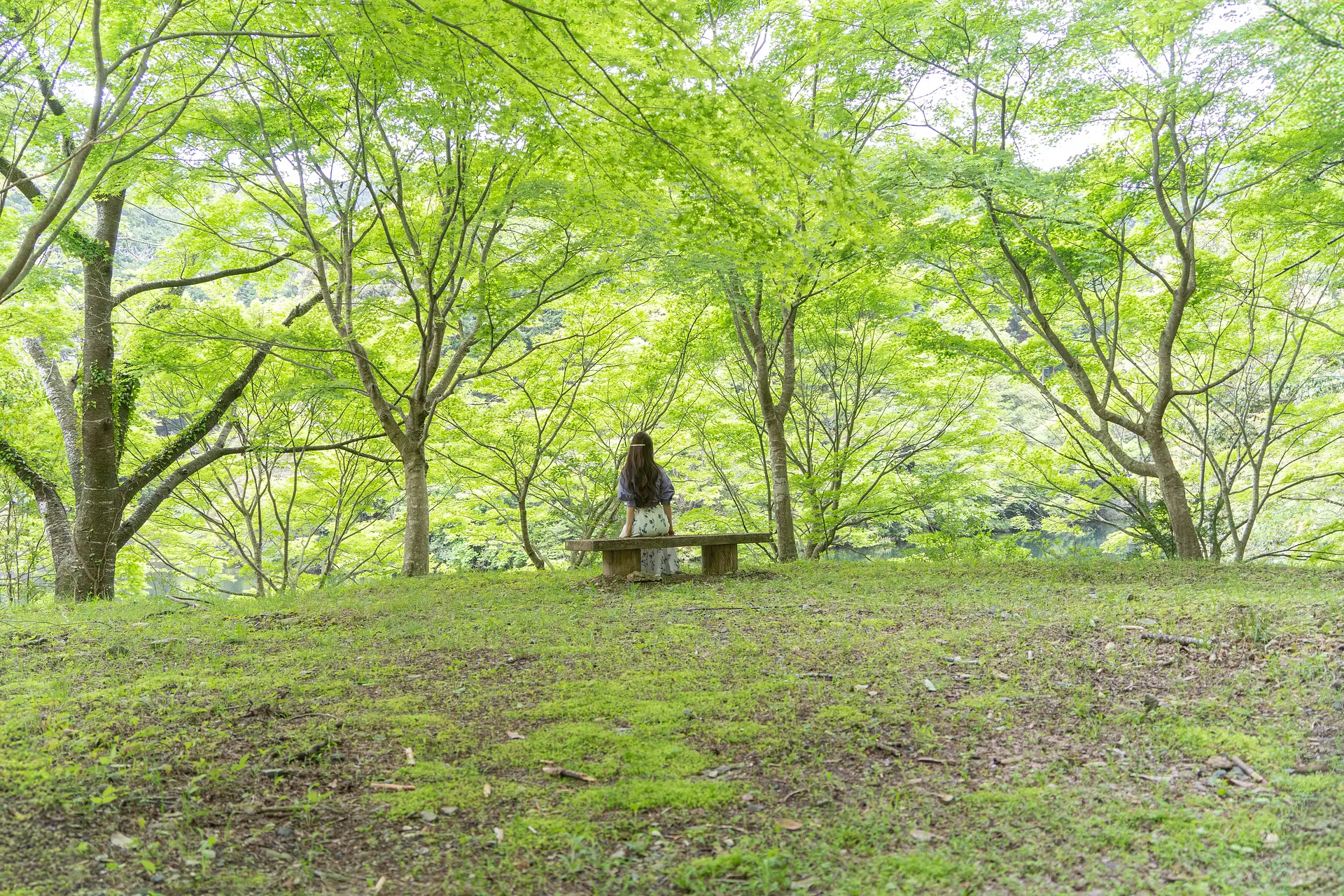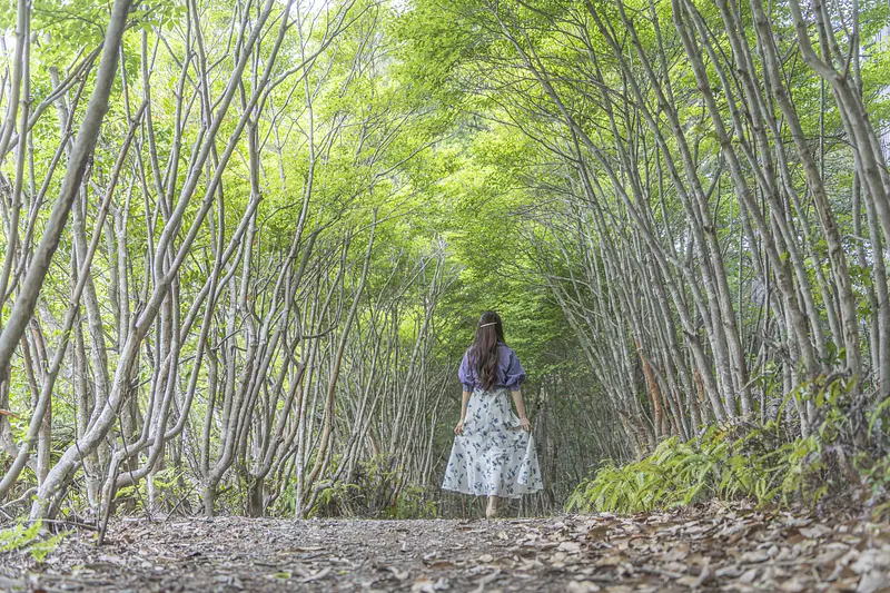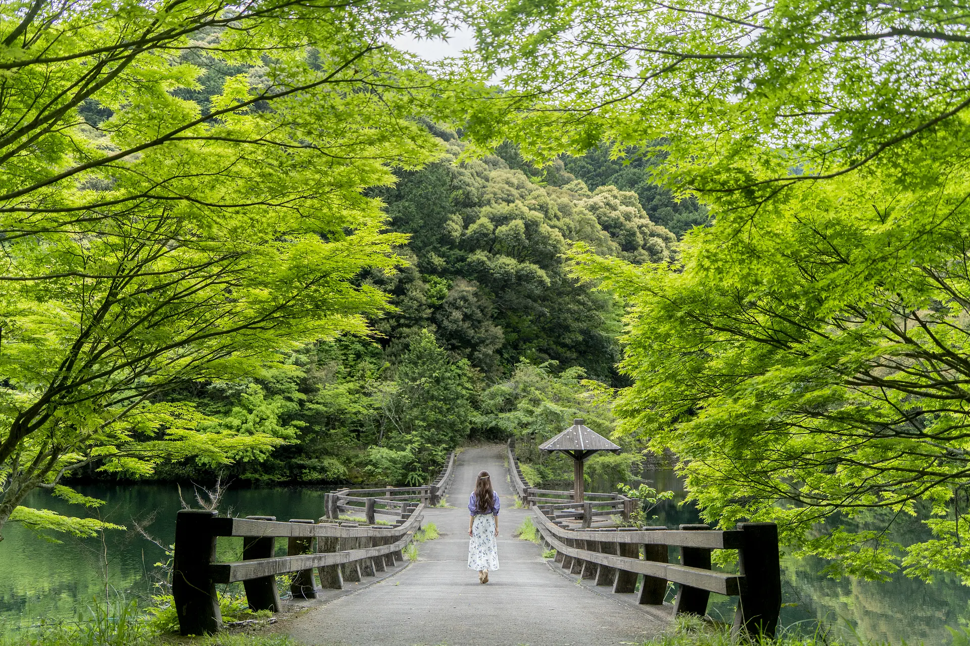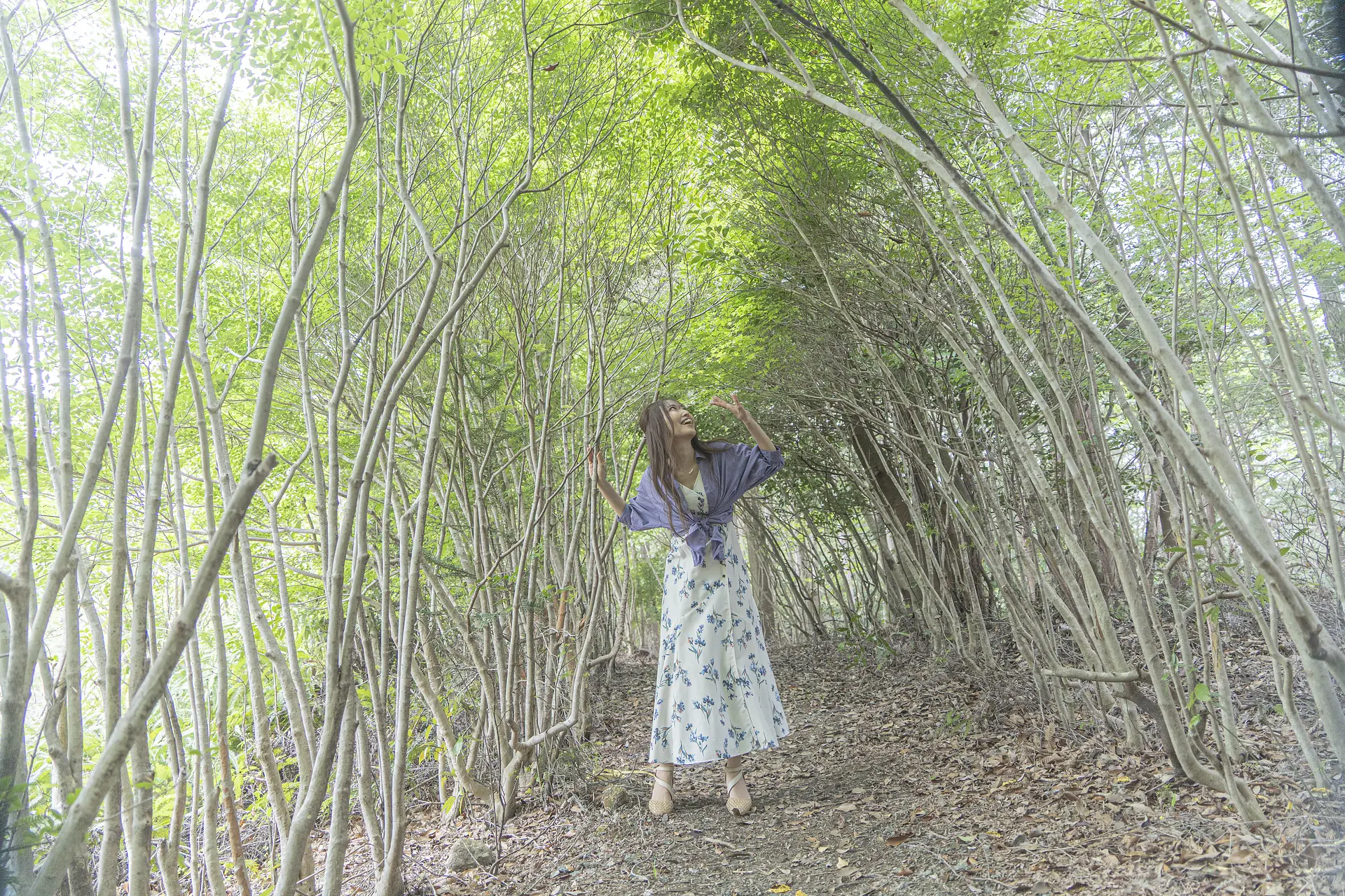 続いては、紀勢自動車道「大宮大台IC」から大杉谷方面へ6㎞、車約12分の「真手公園・丸山公園」です。丸山公園といえば、通称「トトロの森」として真っ赤に染まるドウダンツツジの紅葉のトンネルが大ヒットしましたが、新緑の絶景もご覧の通り負けていませんよ。「トトロの森」感マシマシの新緑のドウダンツツジのトンネル、本当は内緒にしたい!