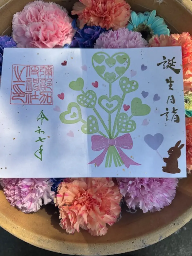 5月は端午の節句のこいのぼりや母の日のカーネーション、そしてクレマチスの豪華な花がデザインされた御朱印。5月の誕生日御朱印は新緑の色を思わせる黄緑色のハートを束ねたデザインです。