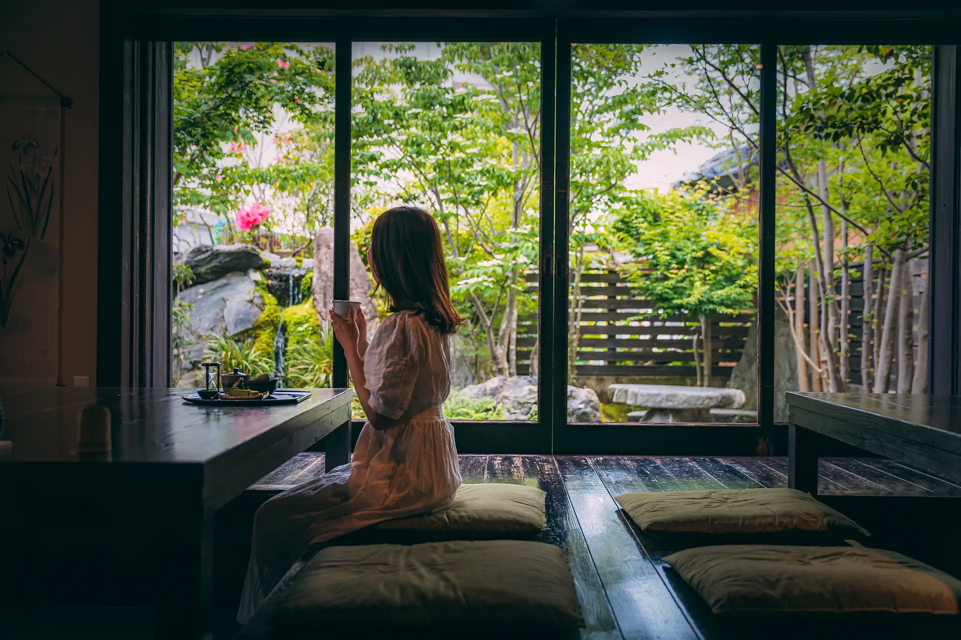 飯南本店だけで楽しめるお茶と和菓子。緑の庭園を眺める日本茶カフェは、10時~16時までの営業です。