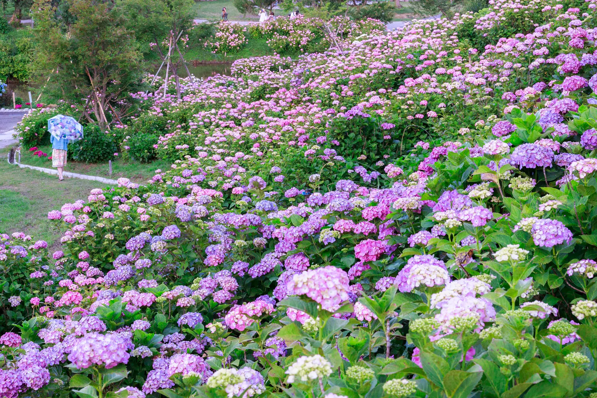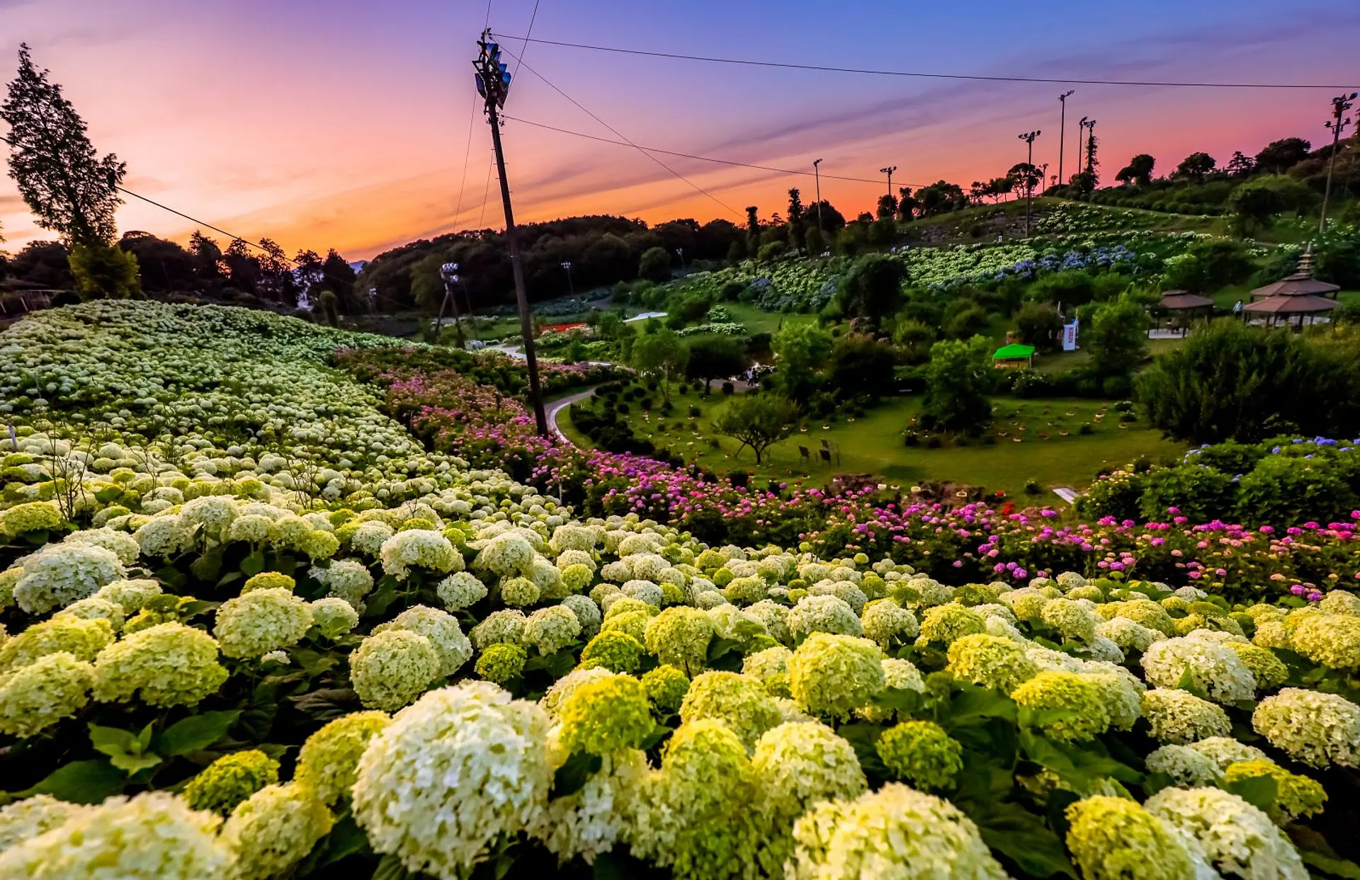 33,000㎡の広大な丘陵地に、色鮮やかな紫陽花が咲き広がる様子は、美しい色のグラデーションが見事で、まさに紫陽花の花絶景。夕暮れ時には、アンティーク調の色合いが広がり、息を呑む美しさを堪能することができます。