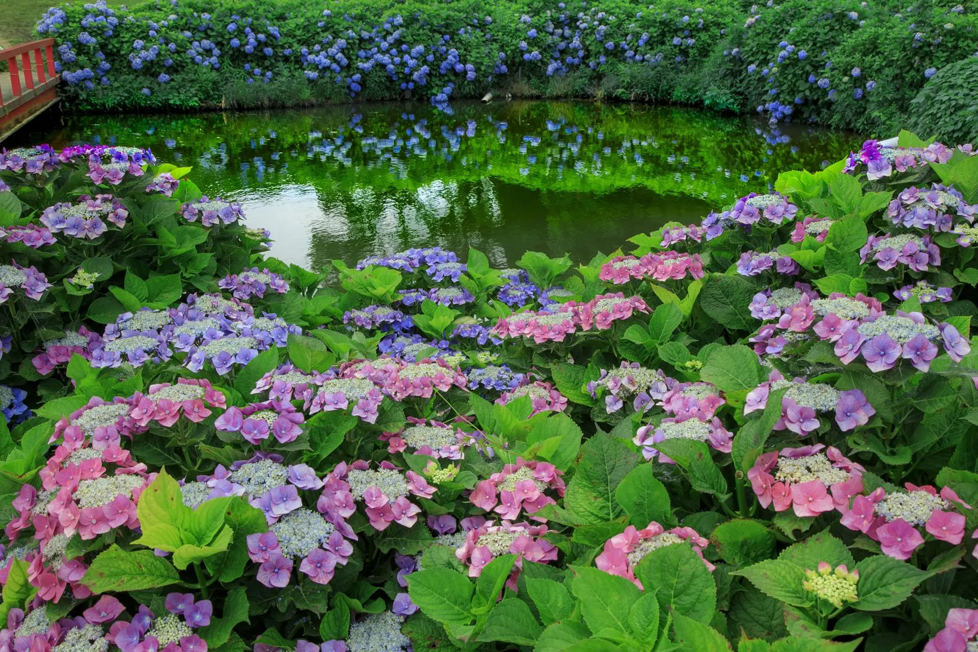 現在、「2025あじさいまつり」が開催されており、風早池のほとりに咲く53品種77,700株のアジサイが次々に見頃を迎えています。