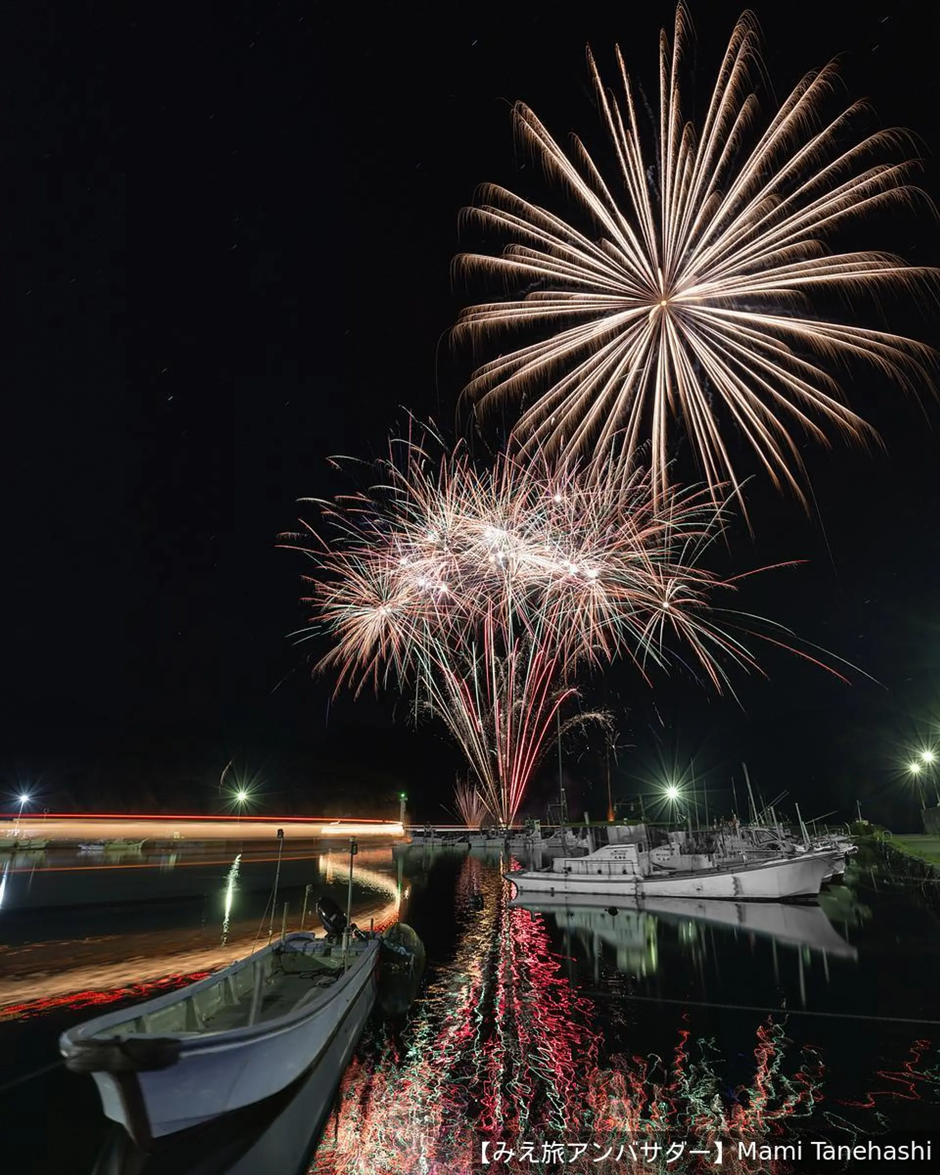 弁天島へ行き来する船の光跡もとてもキレイで、海が穏やかだと水面に花火がリフレクションしますよ!