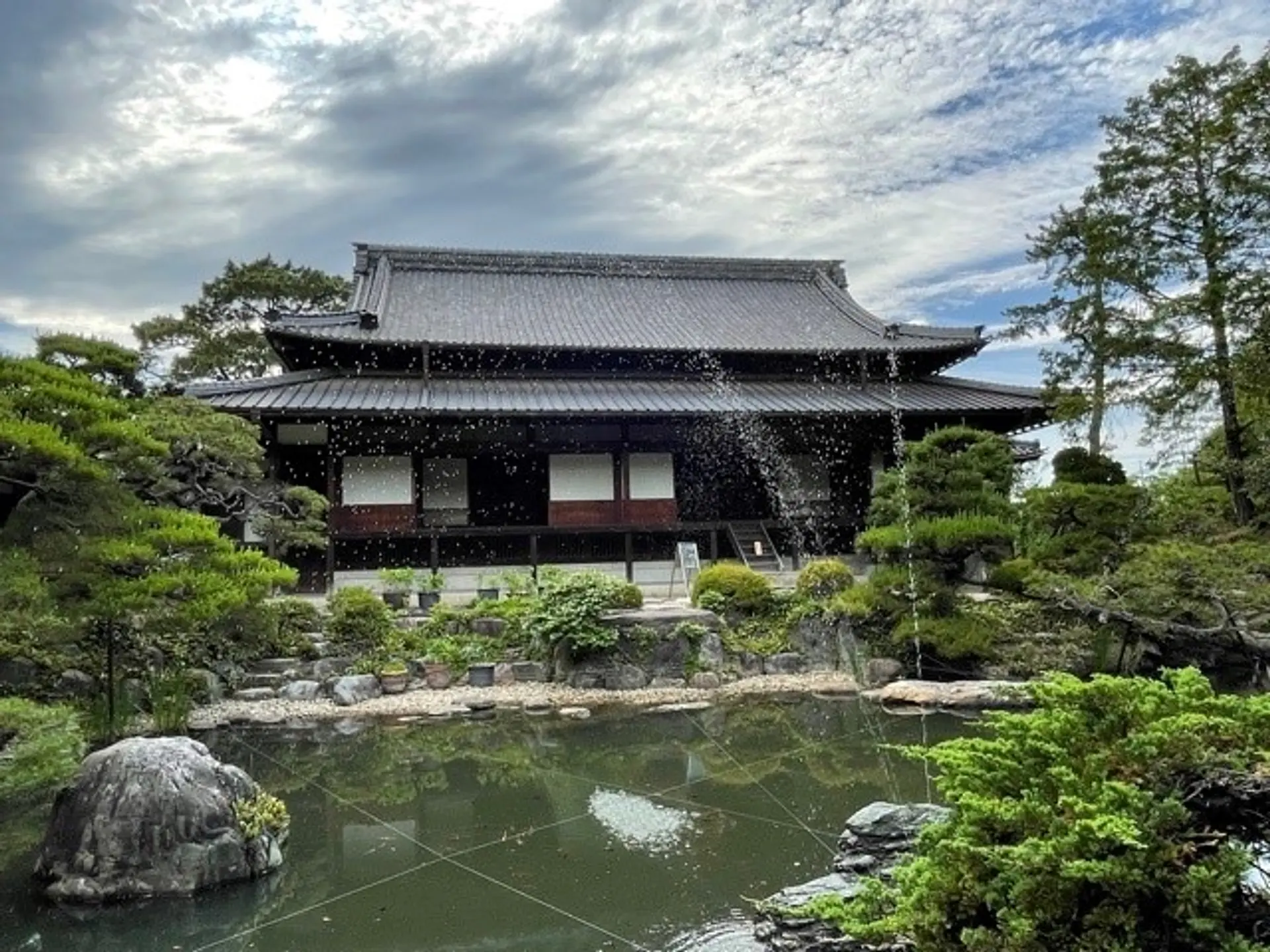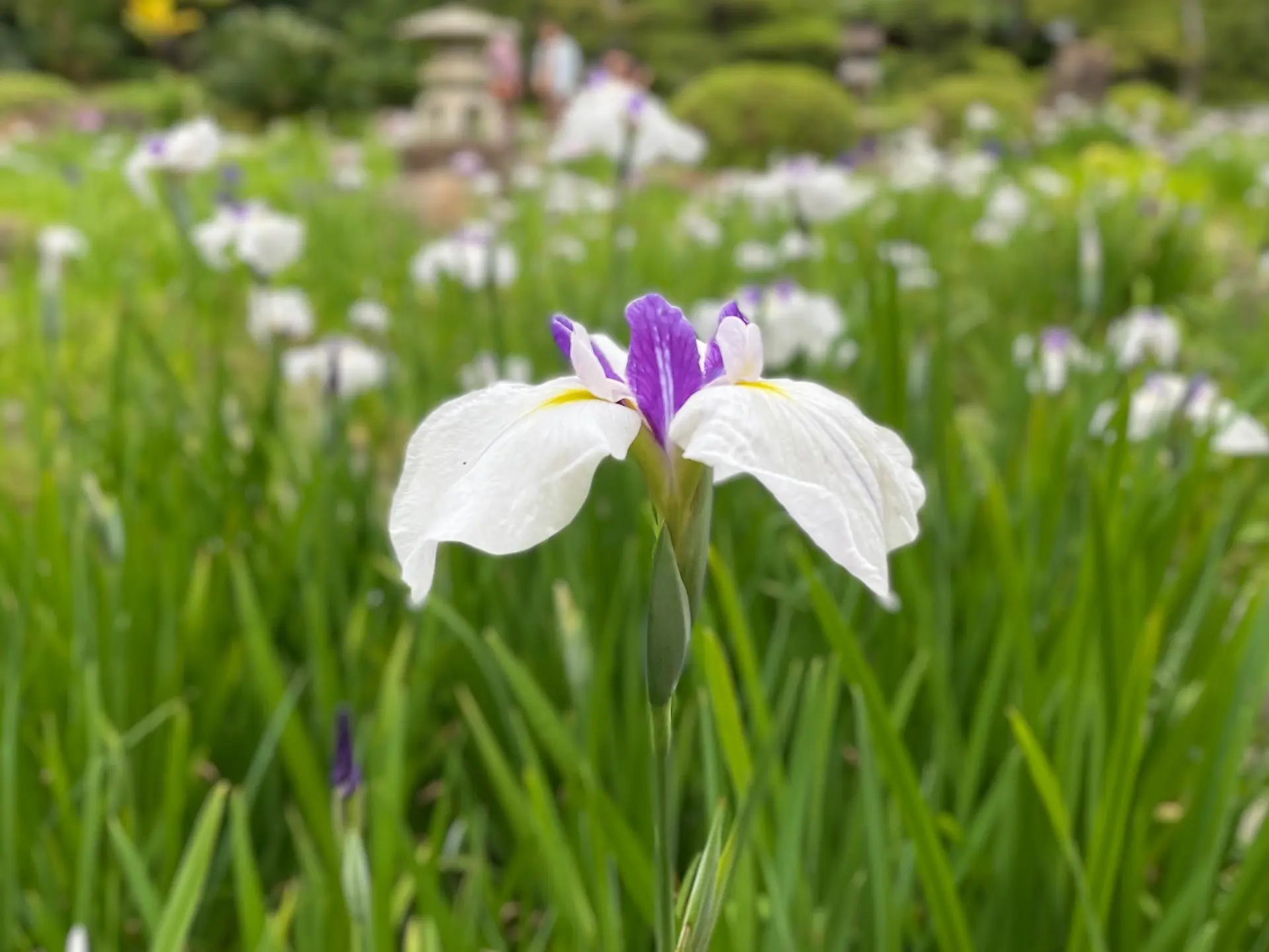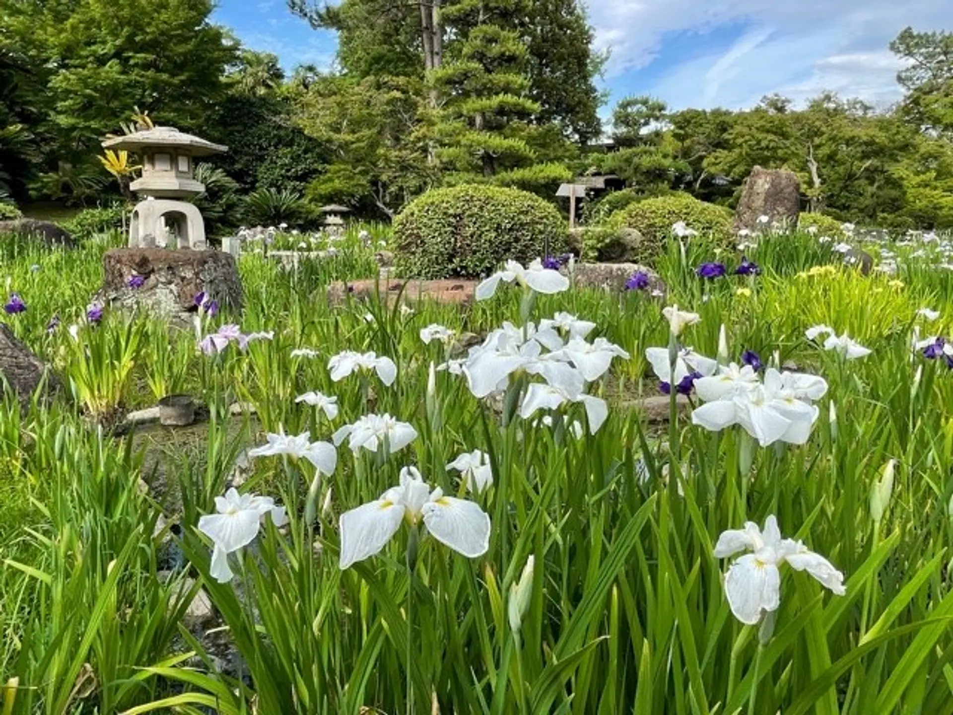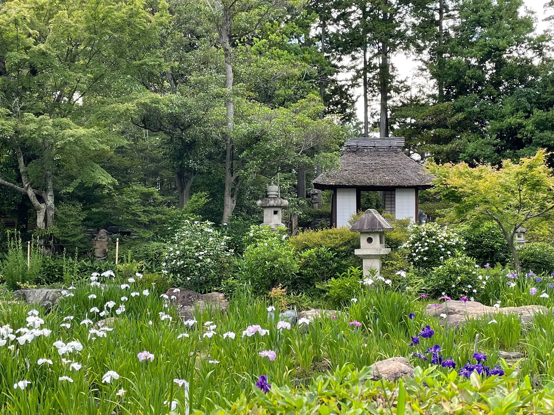 花しょうぶで彩られた庭園には、茅葺き屋根の推敲亭や灯籠などもあり、趣のある美しい風景が広がっています。