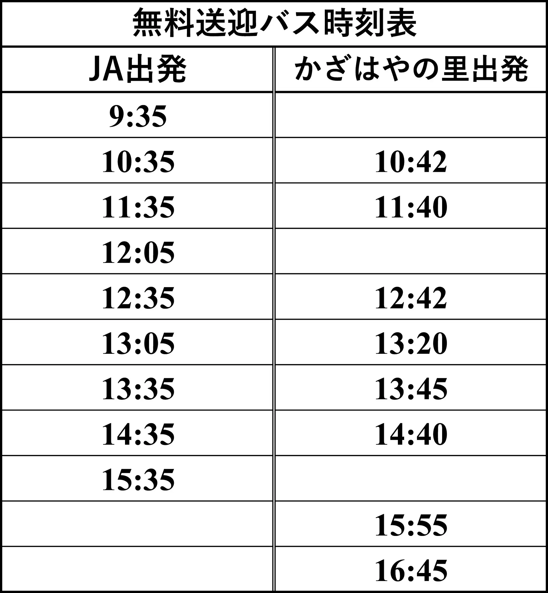 画像2枚目の時刻表通り、JAからかざはやの里まで無料の送迎バスが出ています◎ かざはやの里では普段お出かけしづらい方にも花風景を楽しんでほしいという思いで、送迎バスや駐車場から園内のカートのピストン運行をされています。