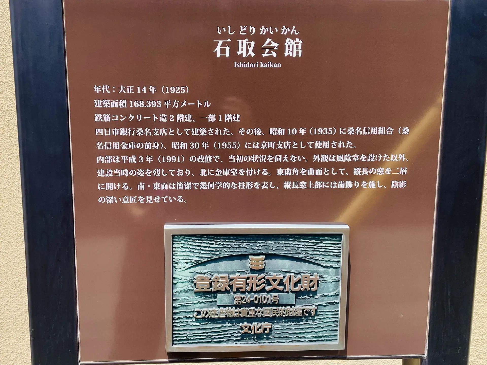大正14(1925)年に鉄筋コンクリート造の四日市銀行桑名支店として竣工され、後に石取会館として生まれ変わる前は桑名信用金庫京町支店としての過去があったんです。