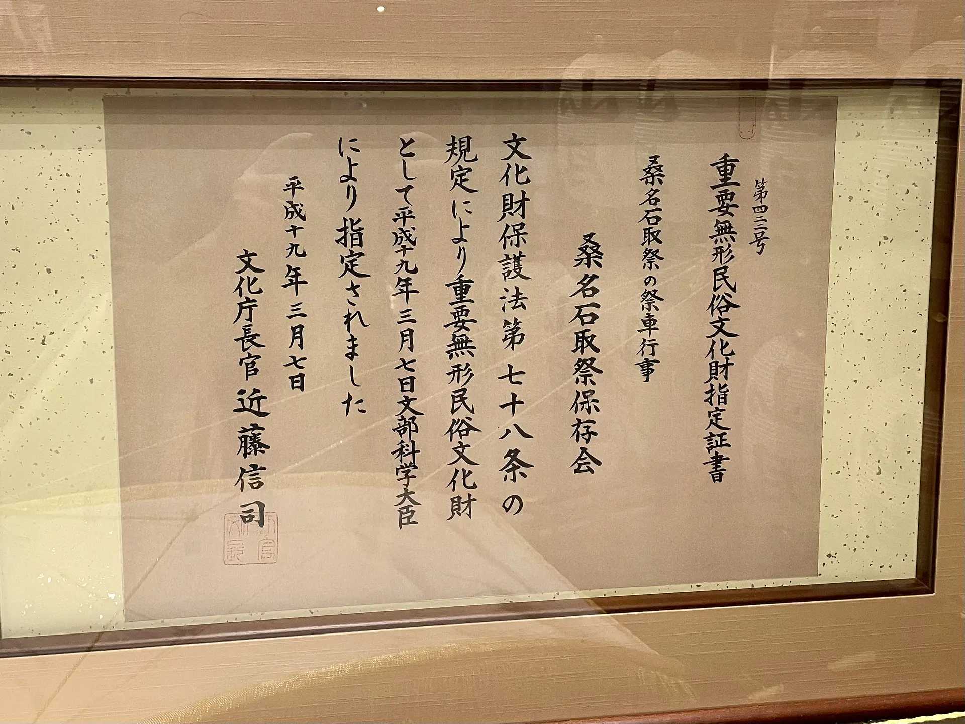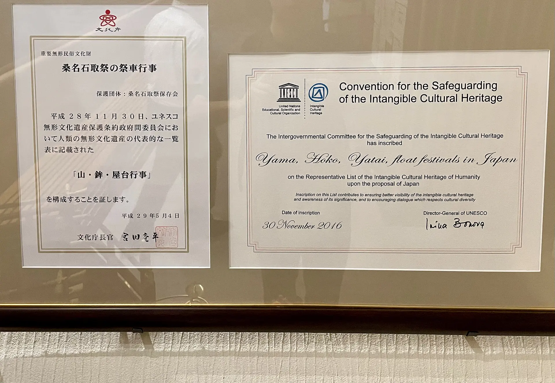 この時の認定証も石取会館には展示されています。日本の宝、世界の宝としての証をぜひご覧ください。