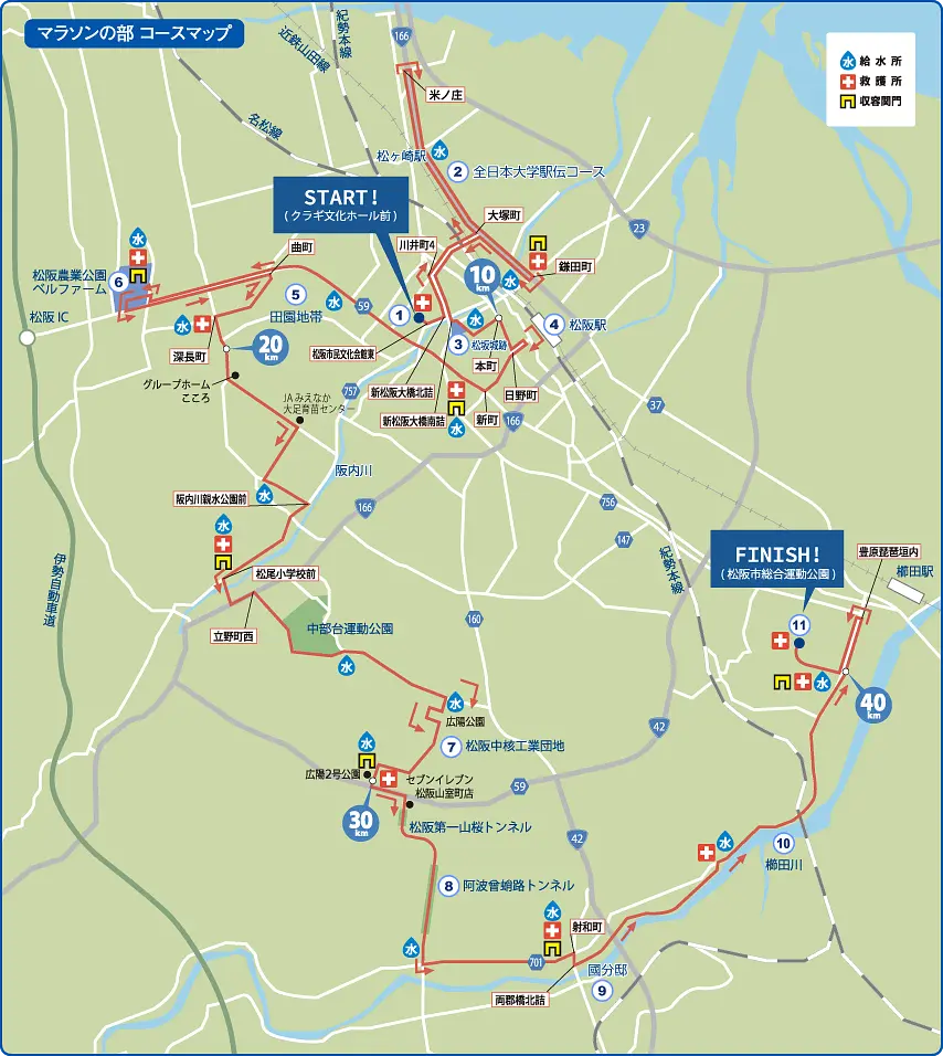 スタートはクラギ文化ホール(松阪市川井町690)、ゴールは松阪市総合運動公園(松阪市山下町111)までの42.195kmがマラソンコースになります。途中で通過する観光スポットをいくつか紹介します。
