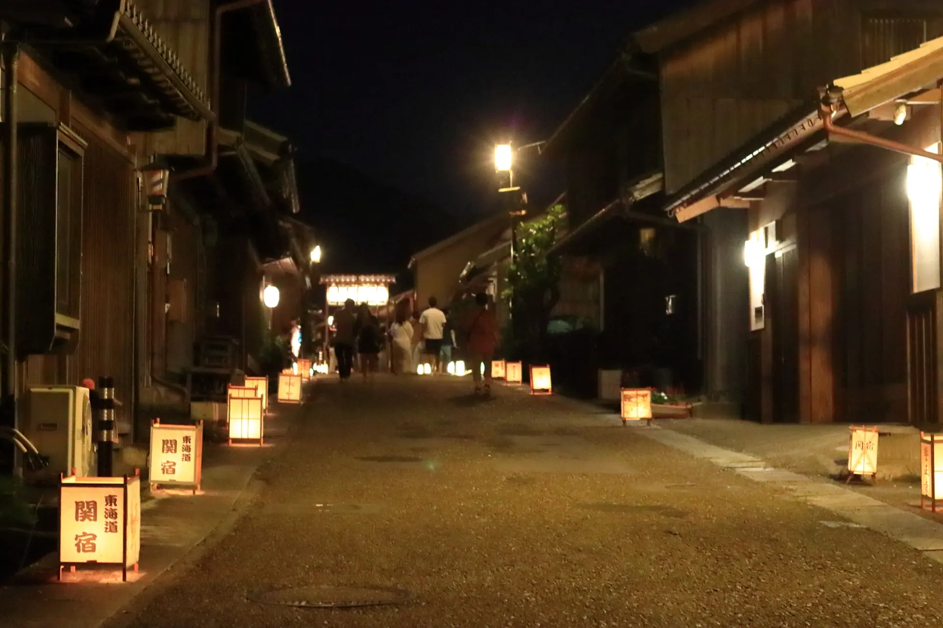 7/19日(土)の夜(18:00~20:30)のみですが、街道の両側に行灯の点灯が行われ、街道の両側に行灯が並んで夜の関宿を引き立てます。昼間とは雰囲気が変わっておススメです。