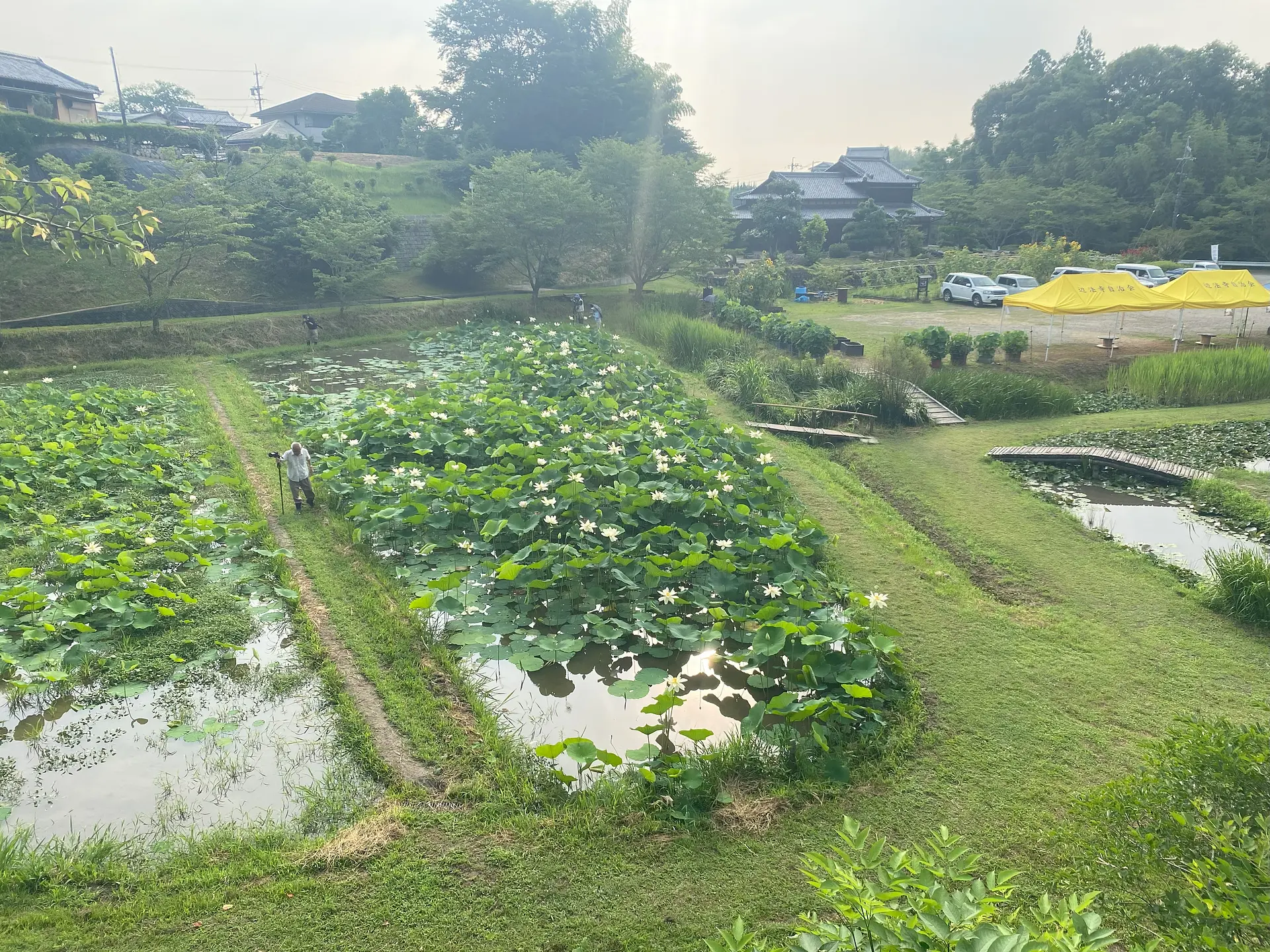 2025年7月6日(日)の早朝に訪れた際には、白い蓮の花があちらこちらで開花し、多くの人々がカメラを構え、数時間で閉じ始める蓮の花を楽しんでいました。