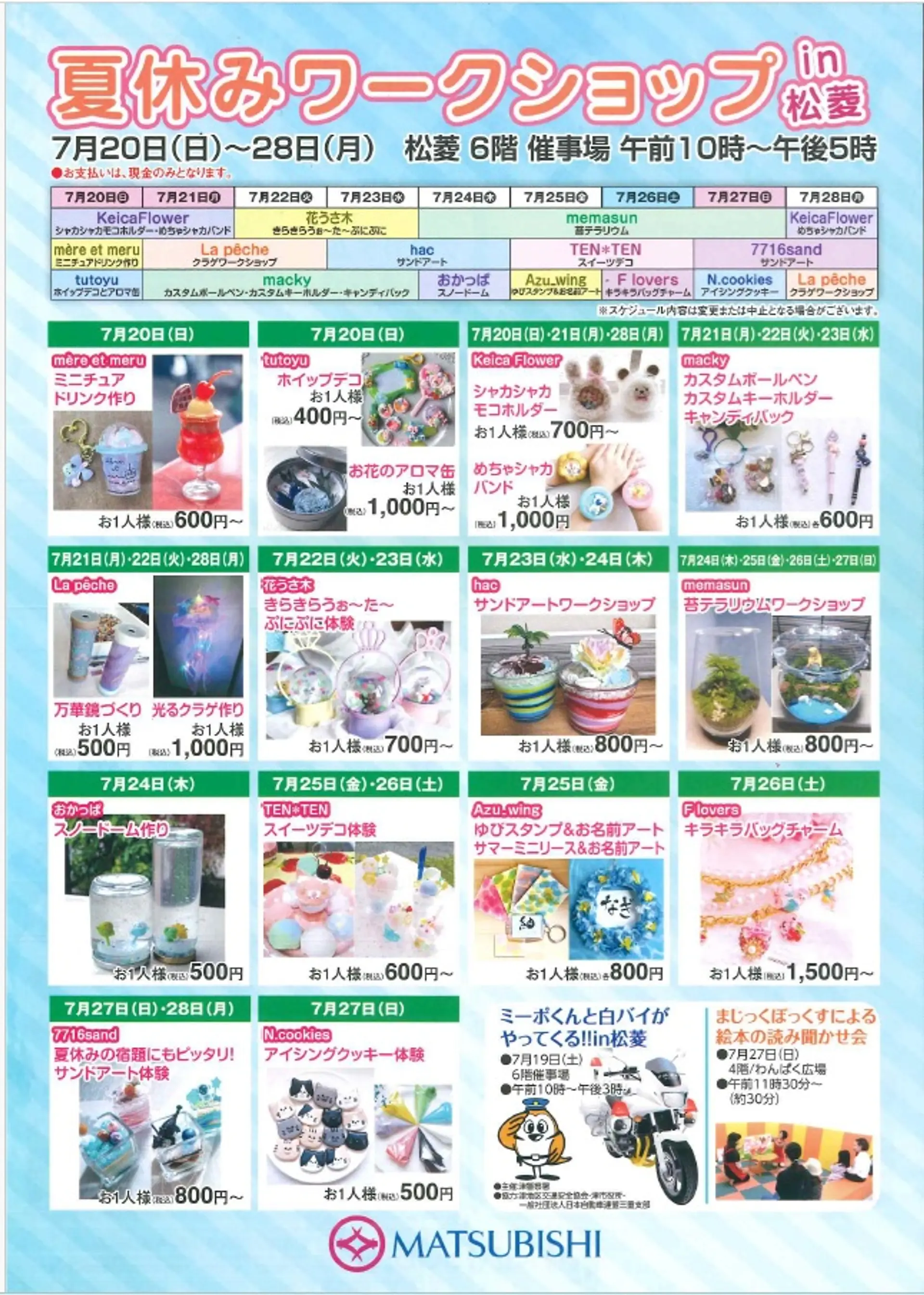 6階催事場にて、万華鏡づくり、サンドアートワークショップ、苔テラリウムワ-クショップ、スイーツデコ体験など、ワクワクするワークショップが盛りだくさん!また、同時にカブトムシ・クワガタムシ展示販売会や様々なイベントが開催されます。※スケジュールは一部変更になる場合があります。