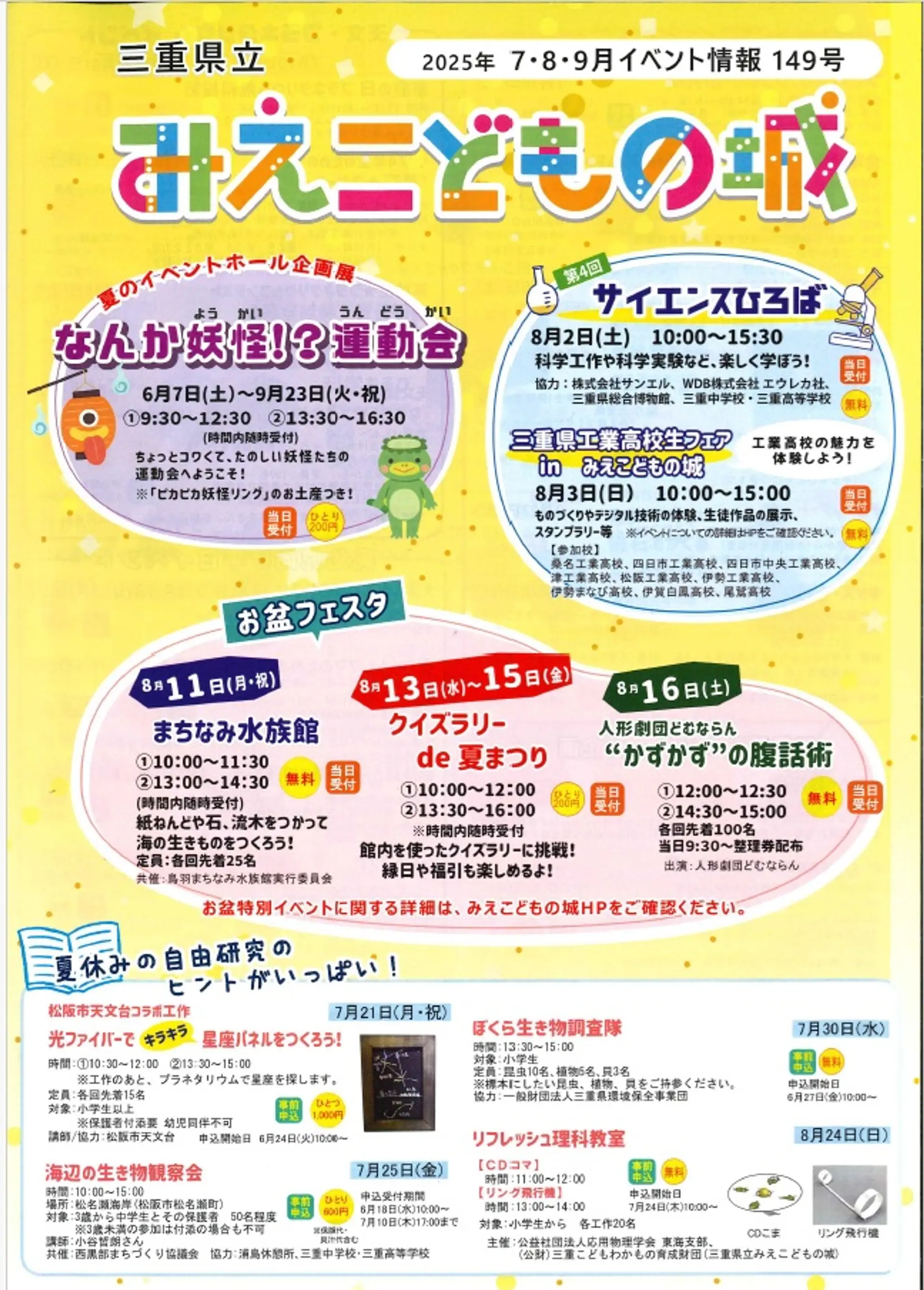 三重県こどもの城では、夏休み期間中にプラネタリウムで星について学んだり、当日参加OKの簡単工作、事前申し込みが必要な科学教室など、さまざまな企画が!8月11日(月・祝)~8月16日(土)には、お盆フェスタも開催されます。