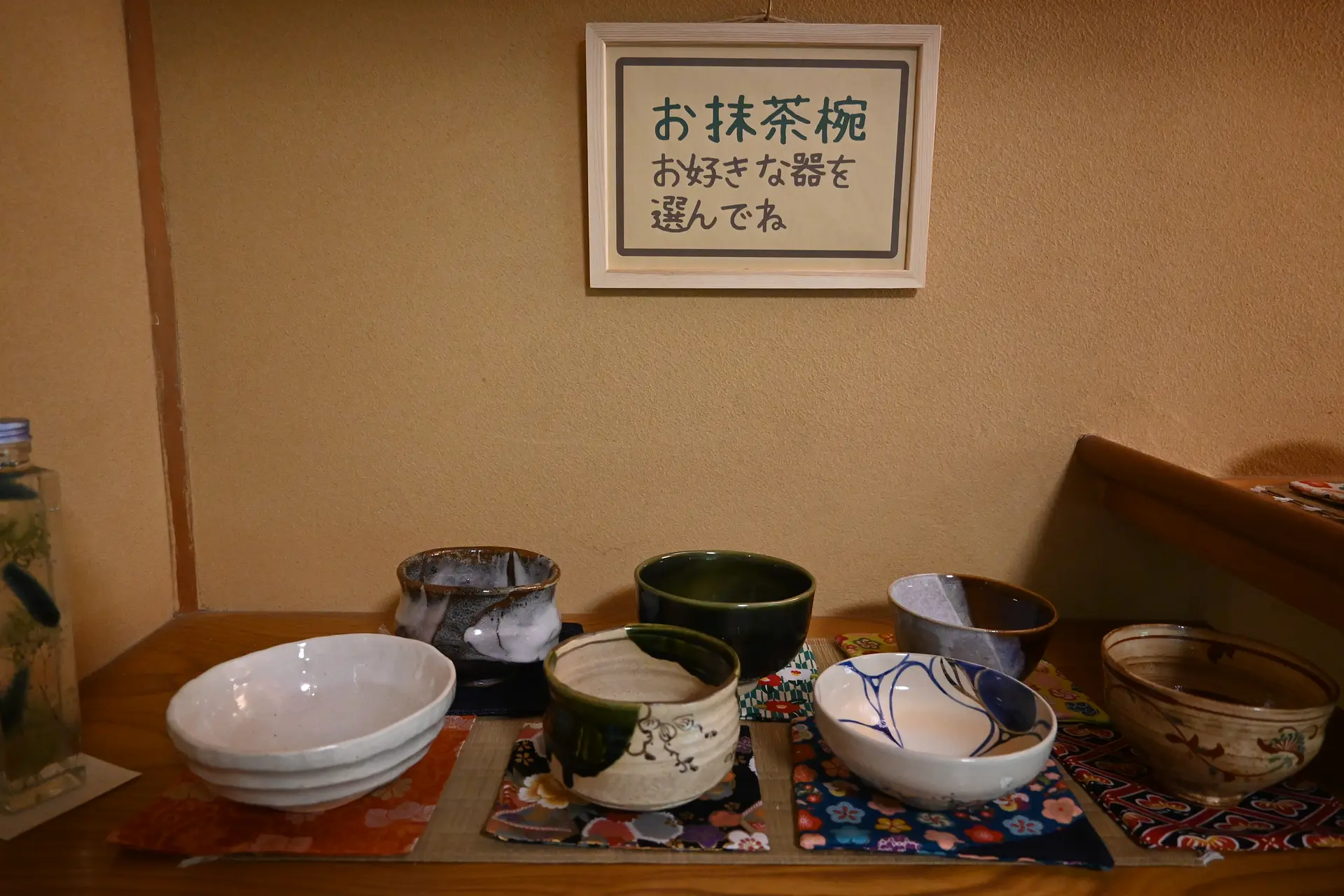 お座敷の上にテーブルを並べカジュアルにお抹茶が楽しめるのが魅力です。抹茶茶碗もその日の気分に合ったものを自分で選べます。