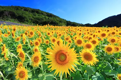 斜面一面に広がる緑緑したもこもこのコキアは写真映え間違いなし。今なら見頃をむかえているひまわりとのコラボレーションが楽しめますよ(8月15日まで)。
